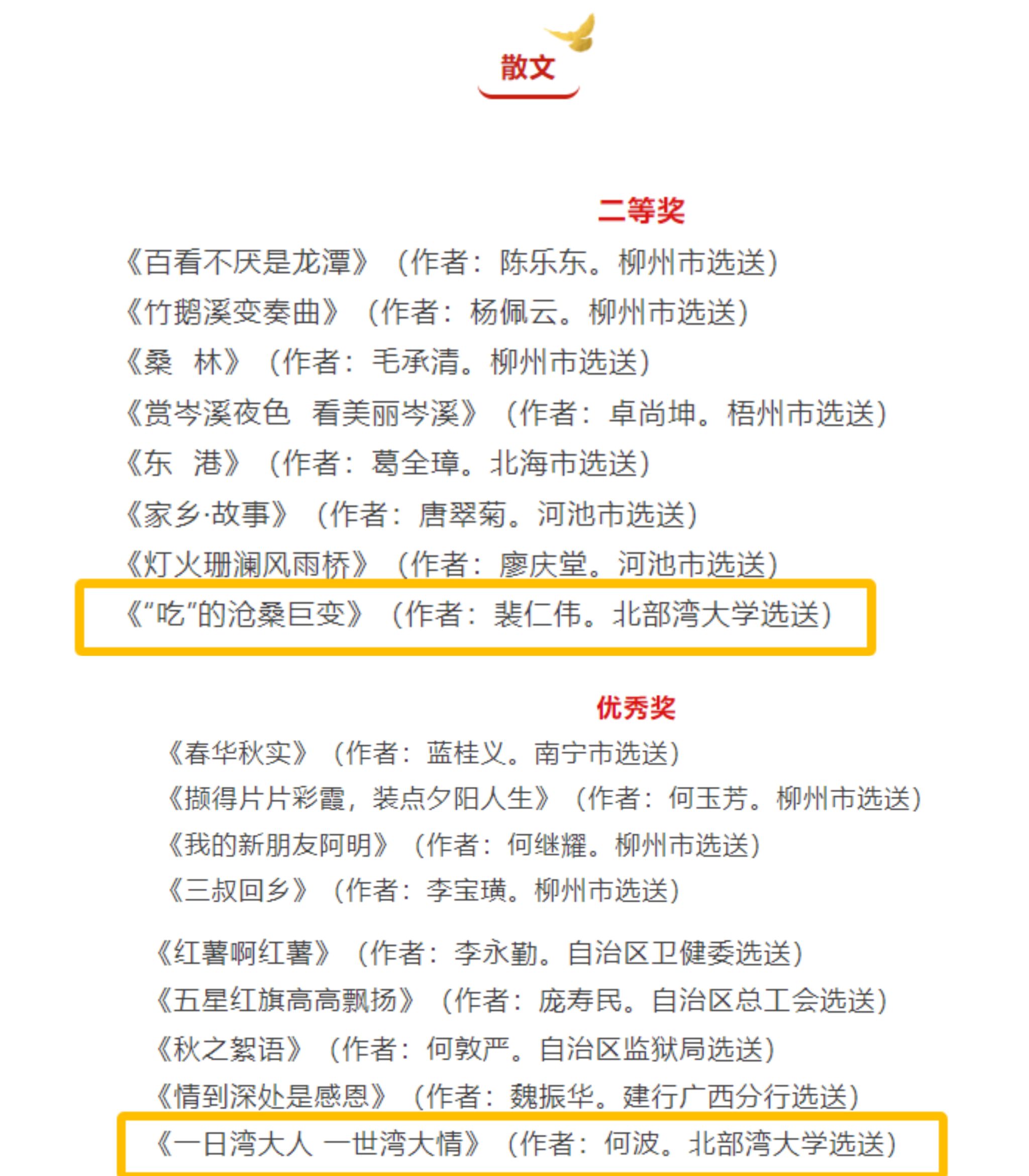 11月18日,自治区党委老干部局公布了广西第十二届“多彩金秋”文化活动主题征文的评选结果。kaiyun体育退休教师裴仁伟撰写的散文《“吃”的沧桑巨变》荣获二等奖,何波撰写的散文《一日湾大人一世湾大情》荣获优秀奖,张蔓燕撰写的诗歌《家国情怀》荣获优秀奖。据悉,此次主题征文共收到各市、部分区直单位选送作品955篇(首),最终评选出一等奖10篇(散文4篇、诗歌5首、其他1篇);二等奖20篇(散文8篇、诗歌10首、其他2篇);三等奖30篇(...