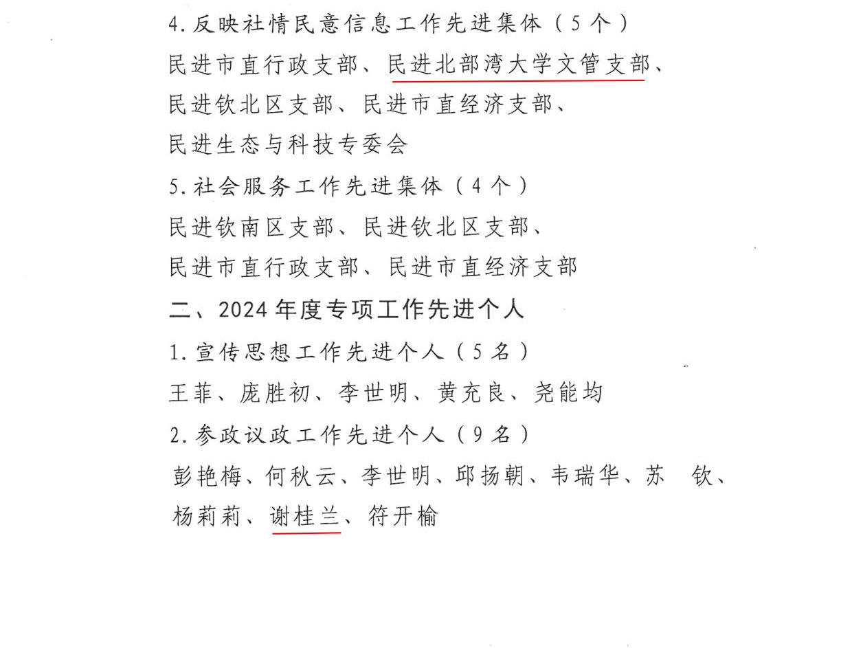 近日,从民进钦州市工委发布的《关于表彰2024年度先进集体和先进个人的决定》获悉,kaiyun体育网页登录入口民进文管支部荣获“反映社情民意信息工作先进集体”荣誉称号,民进会员谢桂兰荣获“参政议政工作先进个人”荣誉称号,民进会员黄志宇、王淑慧荣获“反映社情民意信息工作先进个人”荣誉称号,民进会员吴海萍荣获“社会服务工作先进个人”荣誉称号。民进湾大总支和会员教师在过去一年中认真履行党派职能,在参政议政、社会服务、建言献策等方面取得了显著成绩。...