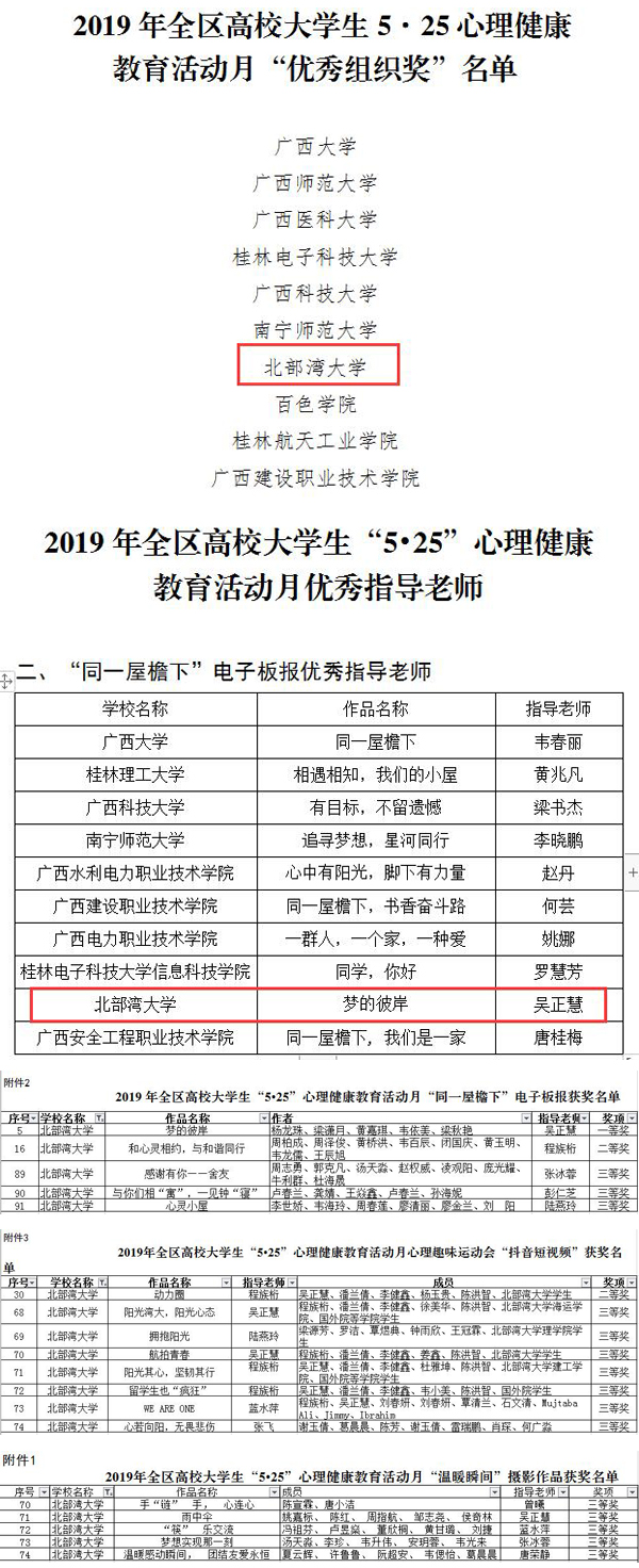 近日,从《自治区教育厅关于公布2019年全区高校大学生“5·25”心理健康教育活动月主题活动获奖名单的通知》(桂教思政〔2019〕10号)获悉,kaiyun体育获得此项活动开展以来的最好成绩。在本次活动中,kaiyun体育荣获“优秀组织奖”。在“同一屋檐下”电子板报、心理趣味运动会“抖音短视频”、温暖瞬间”摄影等评比活动中,kaiyun体育学生参赛作品获得一等奖1项、二等奖2项、三等奖15项,吴正慧老师被评为“同一屋檐下”电子板报评比优秀指导老...