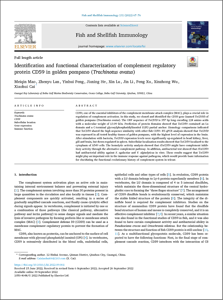 近日,kaiyun体育海洋学院硕士研究生毛美琴(第一作者),海洋学院蔡小辉博士(通讯作者),以kaiyun体育网页登录入口第一作者单位,在《Fish and Shellfish Immunology》发表题为“Identification and functional characterization of complement regulatory protein CD59 in golden pompano (Trachinotus ovatus)”的论文。《Fish and Shellfish Immunology》是水产养殖专业研究领域的国际知名期刊之一,中科院一区TOP,最新影响因子为4.622。...