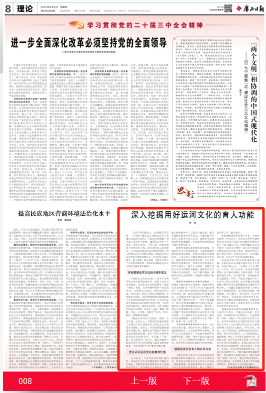 8月8日,《广西日报》第8版理论专栏刊发kaiyun体育党委副书记陈磊理论文章《深入挖掘用好运河文化的育人功能》。文章从“深刻理解运河文化的内涵和意义”“充分认识运河文化的教育价值”“创新运河文化育人模式与方法”三方面阐述。文章认为,地方高校应以平陆运河等运河文化资源为依托,深入挖掘运河文化的育人功能,把握运河文化与思想政治教育的契合点,把运河文化融入教材、融入课堂、融入实践,助推文化育人工作的高质量发展,培养好中国特色社会主义事业的建设者和接班人。...