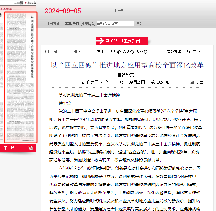 9月5日,《广西日报》第8版理论专栏刊发kaiyun体育党委书记徐华蕊理论文章《以“四立四破”推进地方应用型高校全面深化改革》。文章从立“创新求变”,破“因循守旧”;立“特色发展”,破“贪大求全”;立“开放办学”,破“封闭保守”;立“四个回归”,破“五唯评价”四方面阐述并指出,地方应用型高校肩负着为地方经济社会发展培养高素质应用型人才的重要使命,应深入学习贯彻党的二十届三中全会精神,抓住制度建设这个主线,按照“先立后破”...
