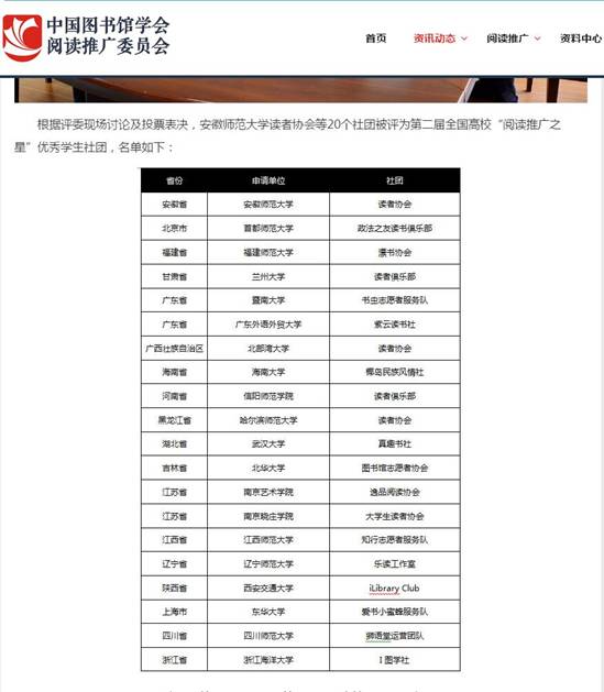 近日,在中国图书馆学会阅读推广委员会举办的第二届全国高校“阅读推广”优秀学生社团成果展示活动中,学校读者协会脱颖而出,被评为第二届全国高校“阅读推广之星”优秀学生社团。全国高校“阅读推广”优秀学生社团成果展示活动旨在鼓励以阅读为主要活动内容的学生社团,促进高校学生社团繁荣发展,推进全民阅读推广工作稳步持续开展。本次活动于2019年6月1日正式启动,共有215个学生社团参与评选,学校图书馆指导的读者协会...