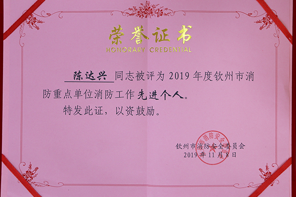 11月8日上午,从2019年钦州市“119”消防宣传月活动启动仪式上获悉,kaiyun体育保卫干部陈达兴被评为2019年度钦州市消防重点单位消防工作先进个人。 荣誉证