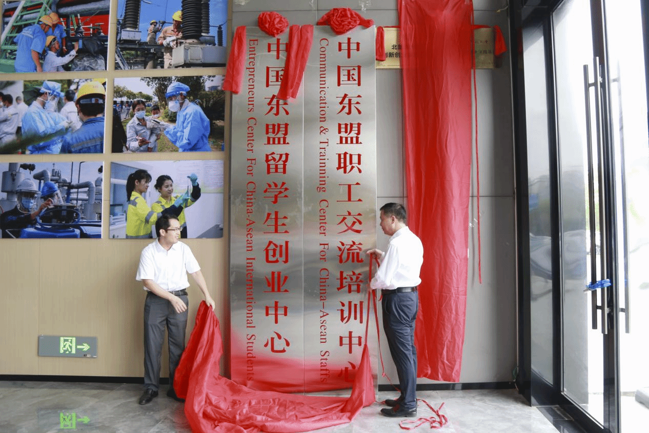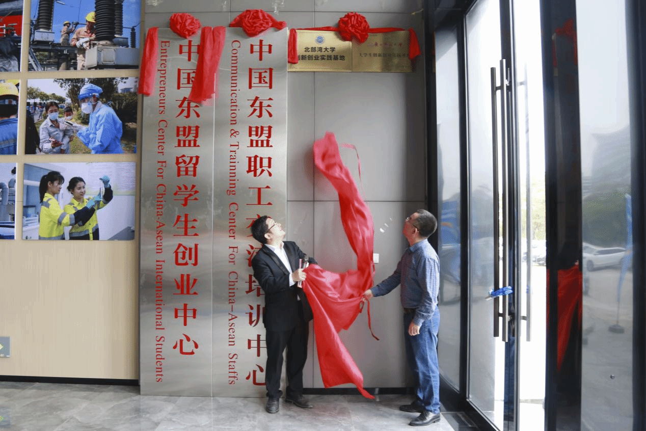 黄善荣主席(右)与尹艳镇副校长(左)为中国东盟留学生创业中心、中国东盟职工交流培训中心揭牌