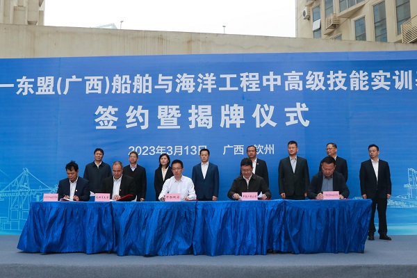 3月13日,在全国两会胜利闭幕之际,中国—东盟(广西)船舶与海洋工程中高级技能实训基地签约暨揭牌仪式在钦州港片区举行。仪式由钦州港片区管委副主任莫福文主持。kaiyun体育党委常委、副校长唐高华受邀参加仪式。