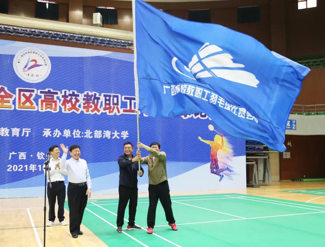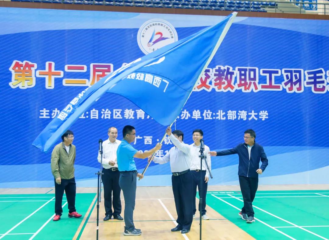 梁智将赛旗交还主办单位领导陈洛。陈洛将赛旗交给下一届比赛承办单位广西财经学院校领导的手中,并宣布“中行杯”第十二届全区高校教职工羽毛球比赛顺利闭幕。