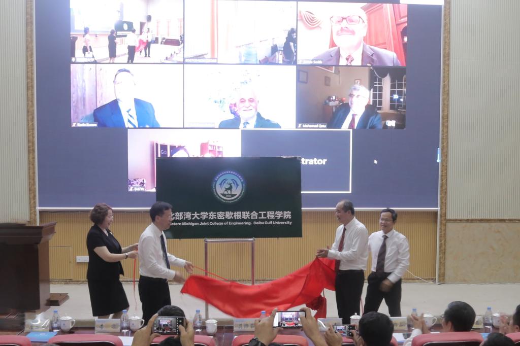 揭牌仪式在学校12号教学楼204报告厅举行。钦州市委副书记莫锦荣,教育厅对外合作与交流处负责同志吕青,自治区北部湾经济区规划建设管理办公室规划和体制改革处副处长李波,学校党委书记韩峻峰,校党委副书记陈锦山,校党委常委、副校长陈磊,校党委常委、总会计师梁智出席揭牌仪式。大洋彼岸,东密歇根大学校长James Smith,副校长Kevin Kucera,东密歇根大学工程技术学院院长、联合工程学院副院长Mohamad Qatu,东密歇根大学视觉与建筑环境系主任Suleiman Ashur,东密歇根大学国际学生招生录取及国际合作项目主管Eva Ye在云端参加揭牌仪式。校党委常委、副校长、联合工程学院院长唐高华主持揭牌仪式。
