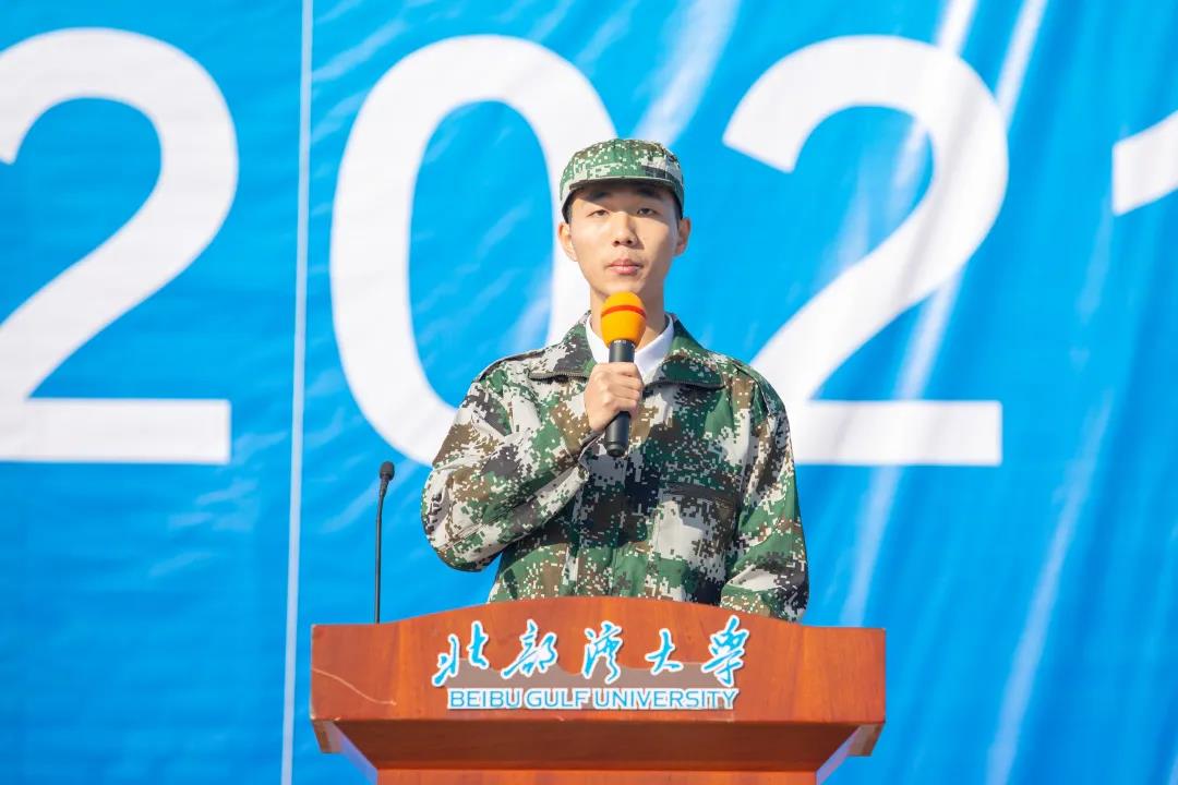 海运学院航海技术专业徐智杰作为新生代表发言。他表示,将秉承“博观内省,达道知行”的校训,“流血流汗不流泪,掉皮掉肉不掉队。坚决圆满完成军训任务!”