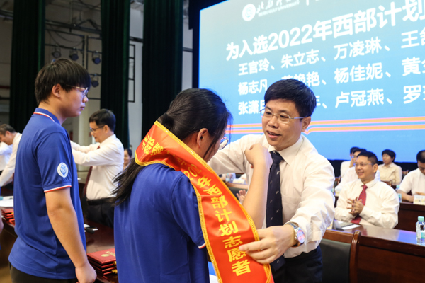 韩峻峰书记为成功入选2022年西部计划志愿者毕业生代表授予绶带