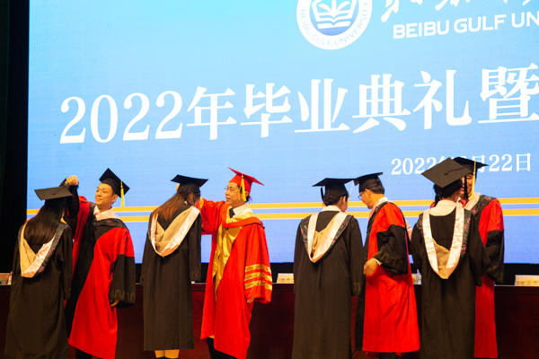 典礼上,学校领导为2022届毕业生代表拨穗并颁发毕业证书、学位证书;对自治区优秀毕业生和学校优秀毕业生代表及获得国家奖学金、校长奖学金的毕业生代表进行表彰;为成功入选2022年西部计划志愿者毕业生代表授予绶带。