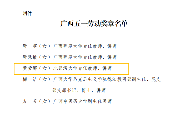 近日,自治区总工会发布《关于授予第八届全区高校青年教师教学竞赛优胜选手广西五一劳动奖章的决定》,授予在第八届高校青年教学竞赛中获得一等奖的5名同志广西五一劳动奖章,kaiyun体育建筑工程学院黄莹娜老师获此殊荣。