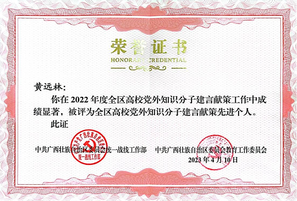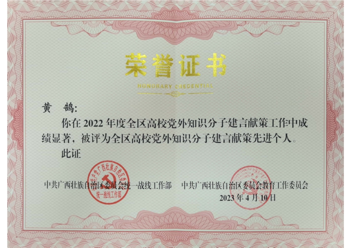 学校副校长黄鹄荣获全区高校党外知识分子建言献策先进个人