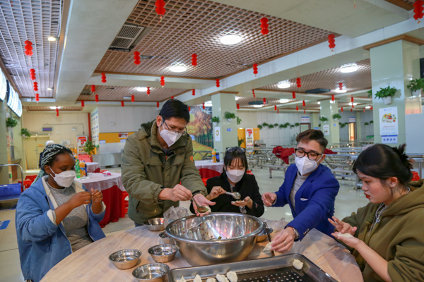 在餐厅里,师生们围桌而坐,一起亲手挑馅、捏褶……一个个憨态可掬、形态各异的饺子变戏法儿似的在大家手里逐渐成形,大家边包饺子边分享日常和假期安排,现场欢声笑语,就像一家人过春节般热闹融洽。“我们非常感谢在过去的几年里,每年都像这样聚在一起,无论来自何方,湾大都是我们共同的大家庭。”来自津巴布韦的机械工程专业留学生MUWOMBI CHIDO开心地说。