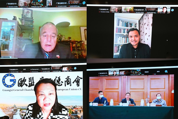 校党委副书记陈锦山、德中友好协会联合会主席彼得•克罗伊茨贝格、国研经济研究院院长李布、欧盟广西总商会会长黄萍、自治区北部湾办副主任覃元臻出席开幕式并致辞。开幕式由副校长黄鹄主持。