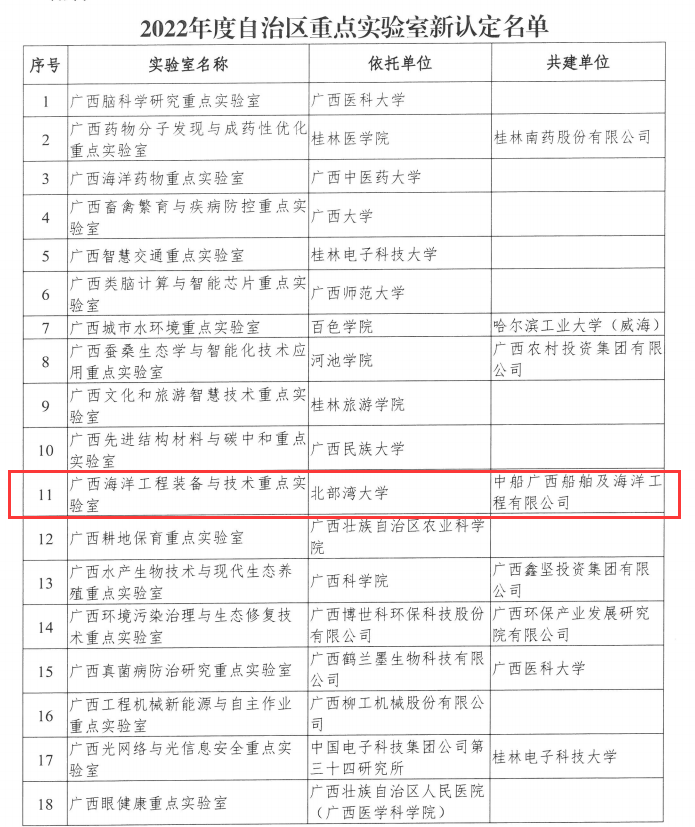 近日,自治区科技厅公布2022年度自治区重点实验室新认定名单,学校“广西海洋工程装备与技术重点实验室”成功获批,成为此次新增认定的18家自治区重点实验室之一,标志着kaiyun体育在船舶与海洋工程研究领域科研能力和水平迈上一个新台阶。