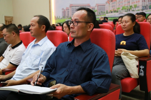 12号教学楼204报告厅座无虚席。学校校长韩峻峰,党委副书记陈锦山、陈湘如,副校长曾彦、唐高华,纪委书记覃宇环,总会计师梁智,党委常委陆衡、马秀明、任才茂在前排就座。
