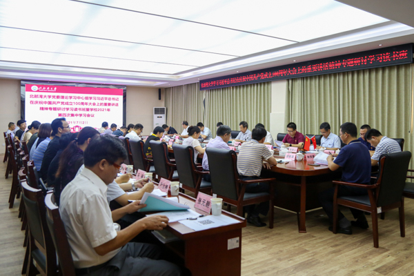 7月2日上午,学校党委理论学习中心组学习习近平总书记在庆祝中国共产党成立100周年大会上的重要讲话精神专题研讨学习读书班暨学校2021年第四次集中学习会议在办公楼523会议室召开。校党委书记韩峻峰主持。