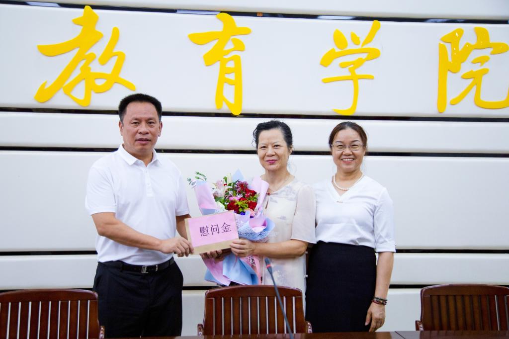 副校长曾彦(左一)慰问教育学院王素华老师(中)