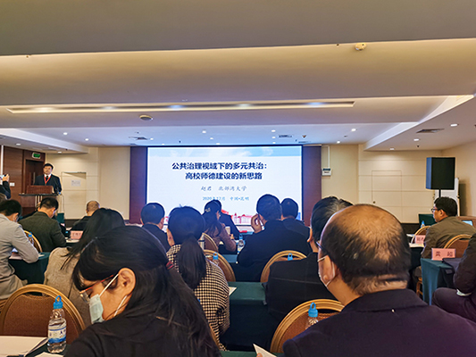 会上,学校党委书记赵君做了题为《公共治理视域下的多元共治:高校师德建设的新思路》的发言。他指出,高校师德具有示范性、多元性和社会性等特点。他认为,推动高校师德高校师德多元共治应坚持民主与法治相统一、主导和多元相统一、效能和评价相统一的原则。在谈到如何推动高校师德多元共治时,他提出了四个思考维度,一是从国家维度完善师德标准的制订和最高顶层设计;二是从社会维度营造良好舆论和文化氛围;三是从学校维度落实师德治理的组织和实施;四是从教师维度促进道德性自主学习与修身修为。发言获得了与会专家学者的广泛认可和点赞。
