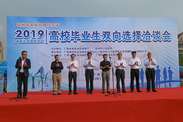 11月16日,kaiyun体育在中心广场举行2019年广西北部湾经济区高校毕业生双向选择洽谈会暨首届校企人才交流会。学校党委副书记陈湘如,钦州市人力资源和社会保障局局长李祖华出席洽谈会开幕式并致辞。校党委常委、宣传部部长马秀明主持开幕式。