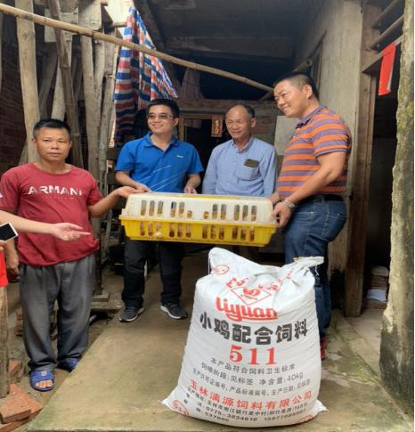 梁智总会计师(左二)向帮扶户赠送鸡苗
