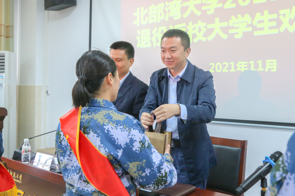 仪式中,与会领导们为同学们一一戴上“光荣退伍”绶带,并送上复学纪念品,勉励同学们勤勉学习,做德才均备、体魄健全的湾大人。