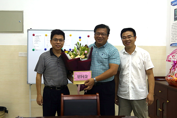 韩峻峰校长(左)慰问先端科技发展研究院朱留存教授(中)
