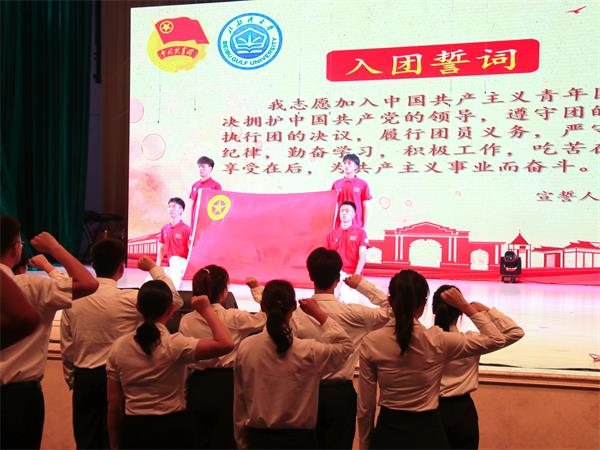 面向团旗,紧握右拳,铮铮誓言,铿锵有力。“回望百年之路,勇担青春使命,愿我们在未来,能够不负胸前的这枚团徽,成为有梦想、勇担当、最热血的优秀团员”大会还为新入团团员举行了入团仪式及入团宣誓活动。
