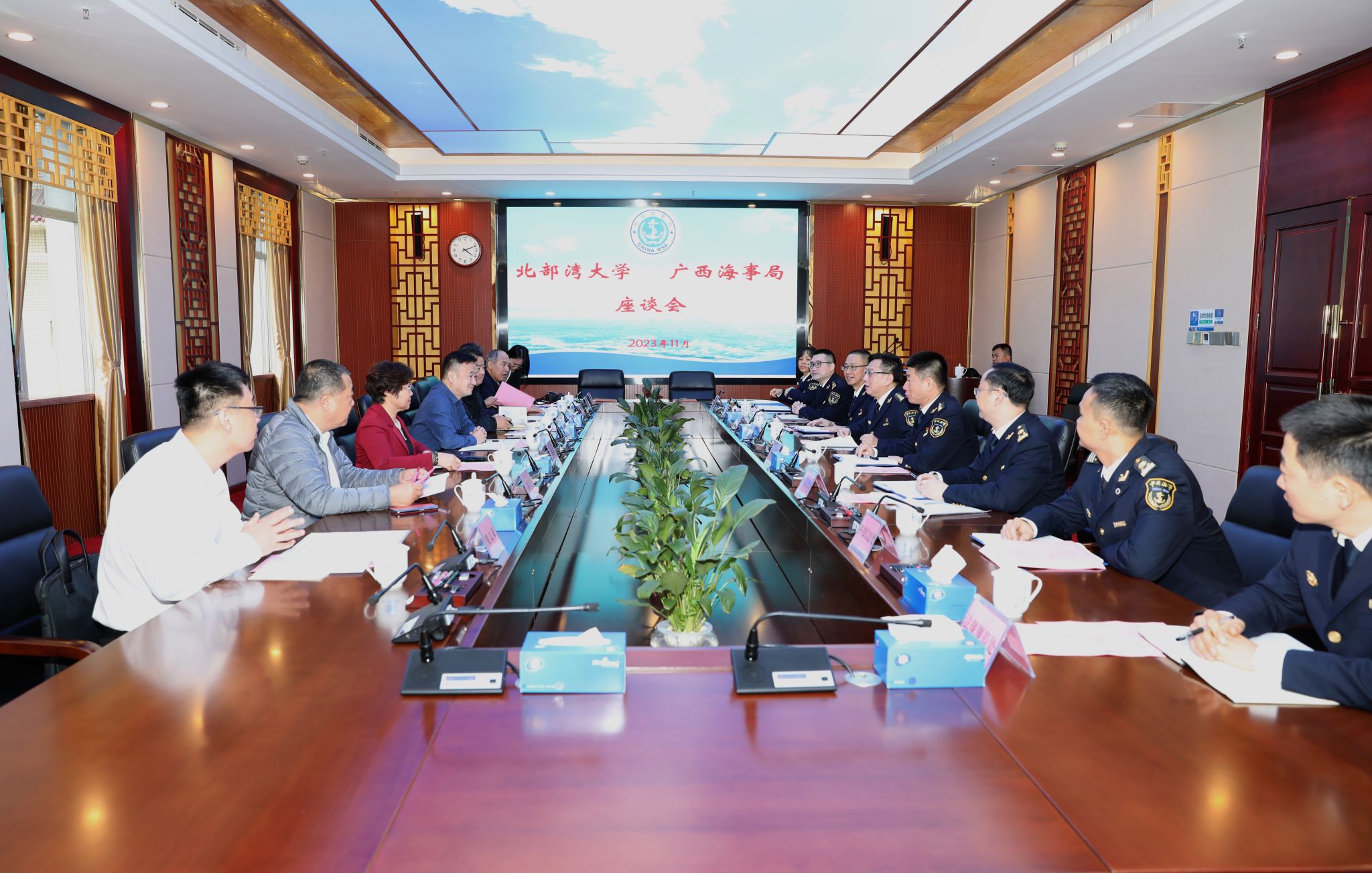 11月15日,校党委副书记、校长苗剑,党委常委、副校长闫松银一行8人赴广西海事局调研交流。广西海事局党组书记、局长李雪松,党组成员、副局长宋国锋出席会议。