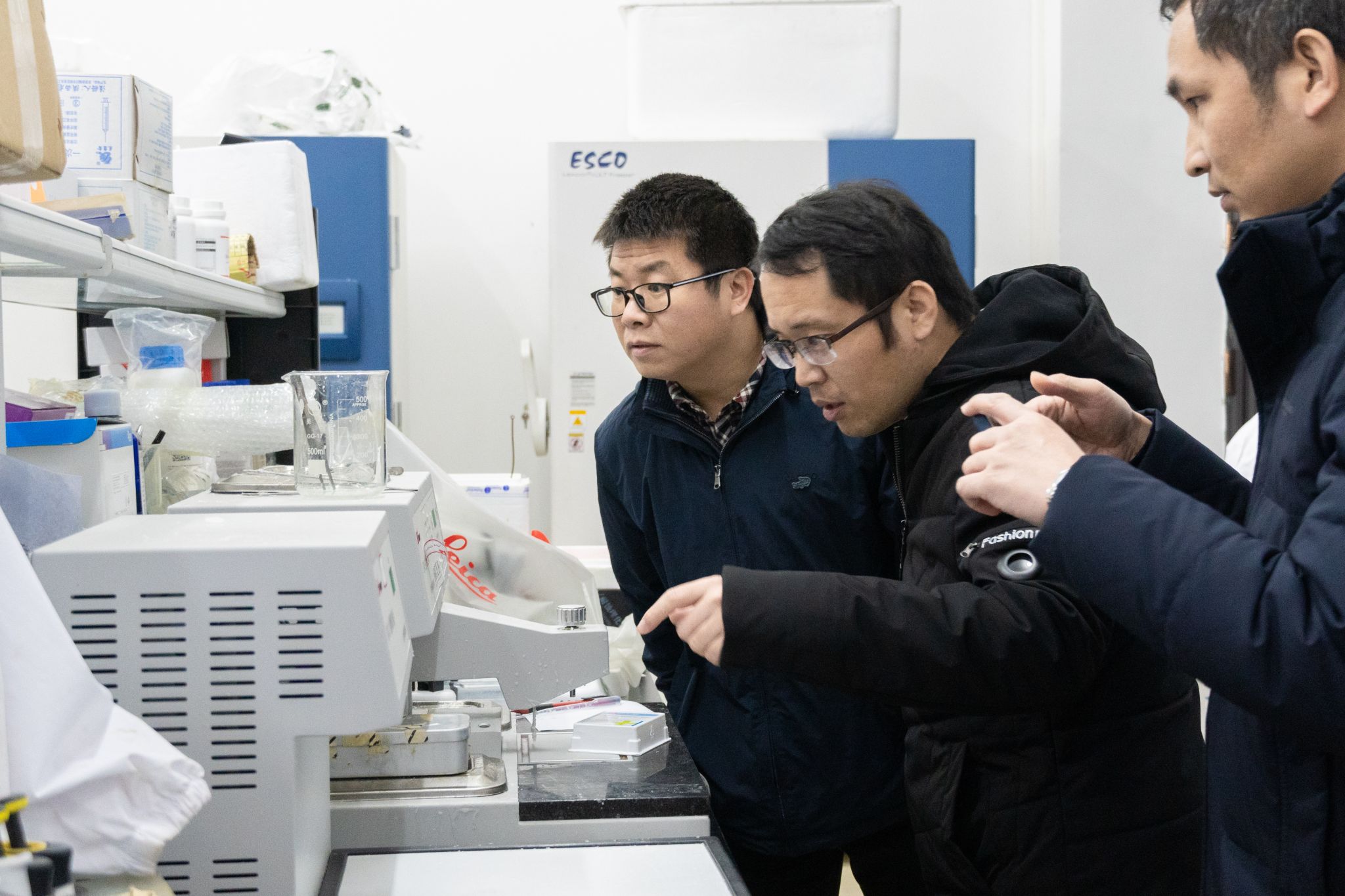 尹艳镇副校长(中)对海洋学生物饵料培养室进行专项检查指导