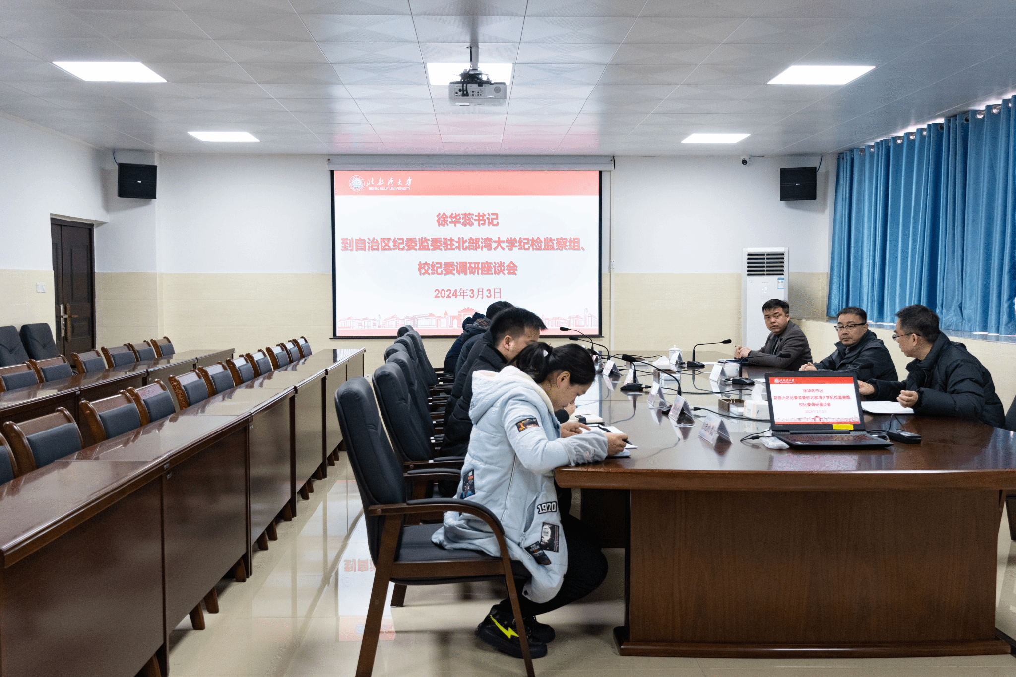 徐华蕊实地调研了学校图书馆清廉阅读体验区、驻校纪检监察组新建的功能场所区,了解学校纪检监察工作开展情况,认真听取谢立平对自治区纪委监委驻校纪检监察组、校纪委的工作及今年工作计划的汇报,并与专职纪检、巡察干部进行了座谈。