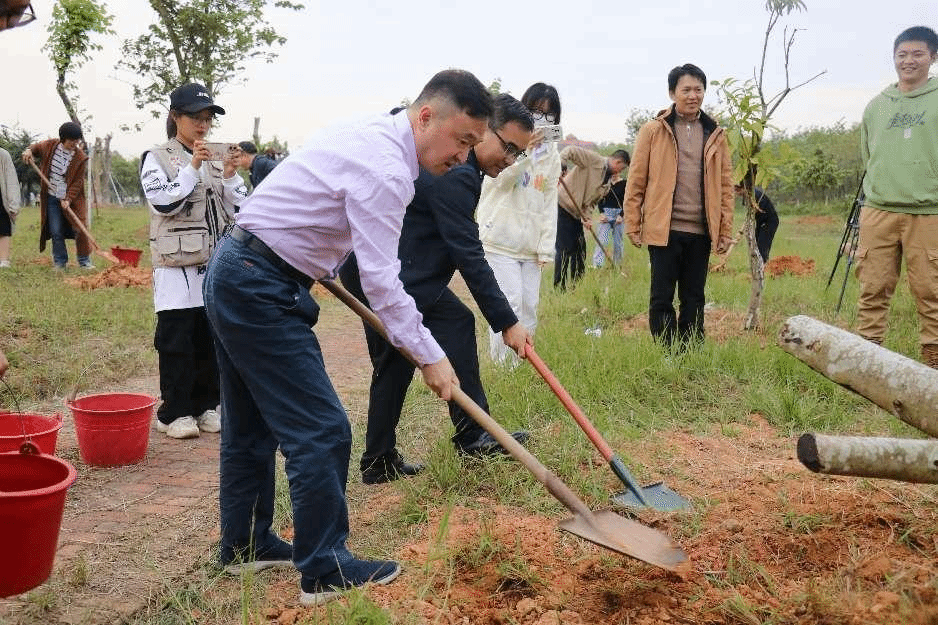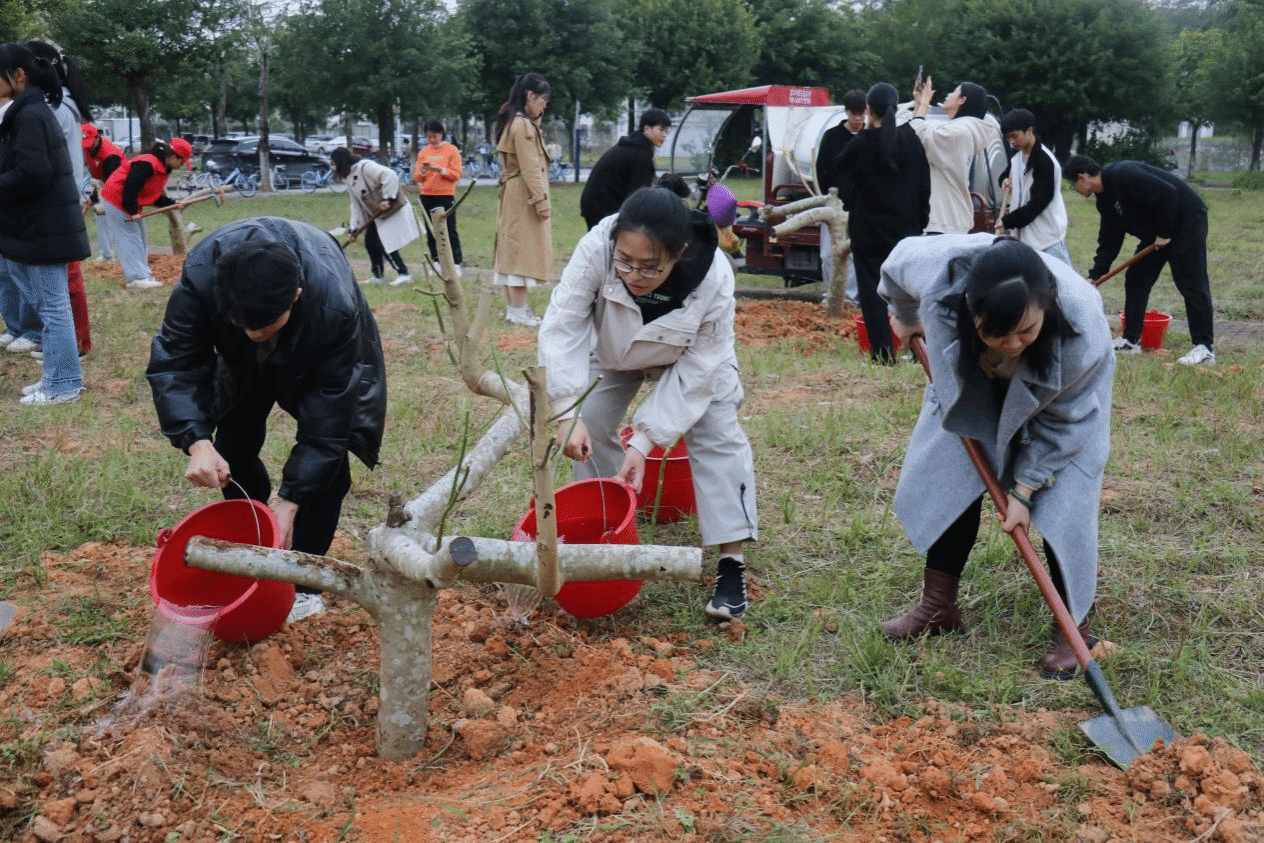 学校党办校办代表、各学院团委书记及学生代表、校“青马工程”培训班学员、校现代营销与管理协会成员近100人一同参与植树。