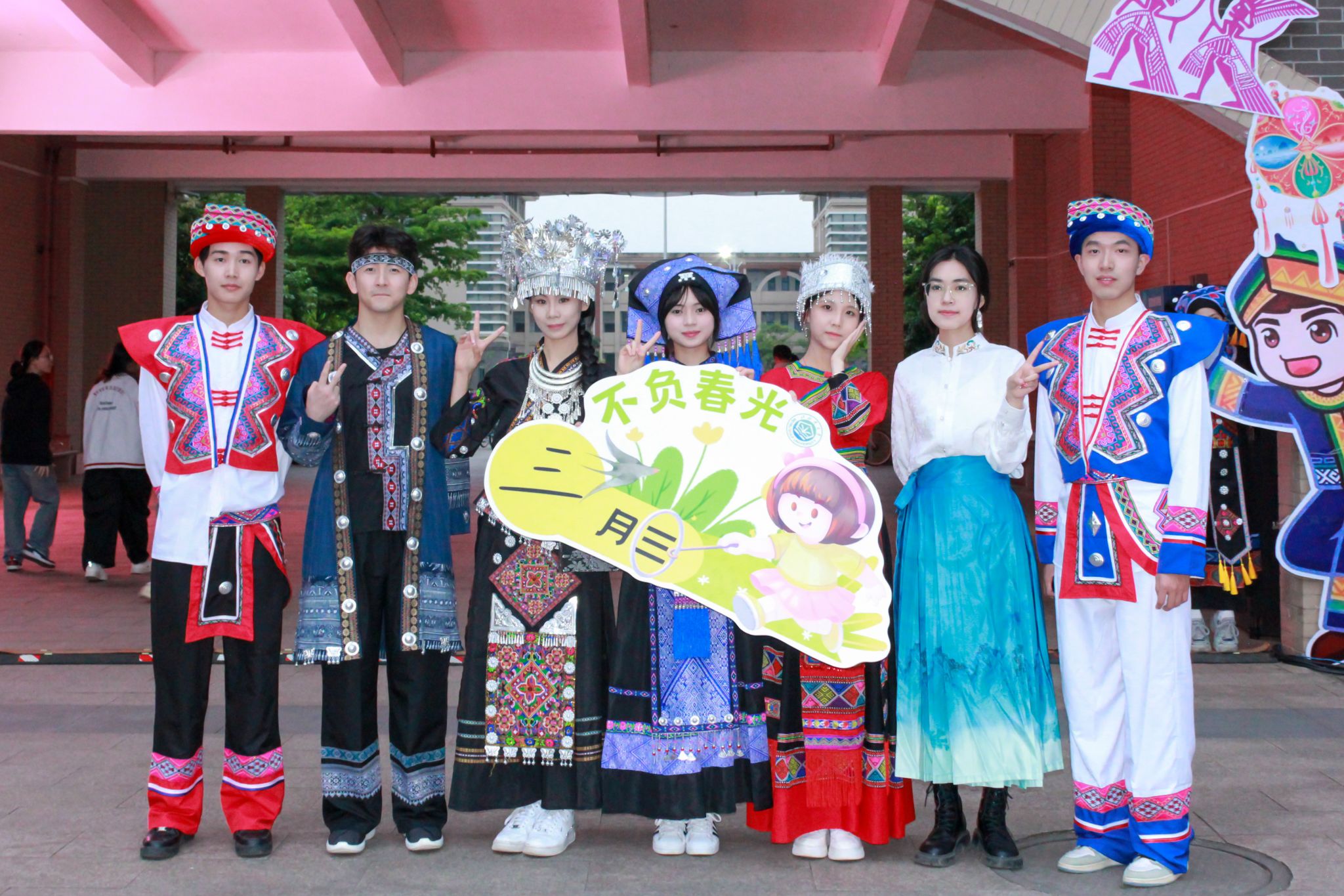 在民俗文艺演出区域,随着《大地飞歌》的乐声奏响,壮乡民族服饰走秀为演出拉开了序幕,《山歌好比春江水》《走在山水间》《壮族敬酒歌》等民俗歌曲及舞蹈接连上演,为师生呈现了一场视听盛宴。演出渐入尾声,在场的演员和观众一同走到场地中央,共同跳起竹竿舞,将现场气氛推向高潮。闻讯前来观看的师生纷纷表示,“没想到能在自己学校里看到现场的唱山歌表演”“不仅能在一旁观看,还能加入其中,太有意思了”“从未像今天能近距离地感受广西三月三的节日氛围”。