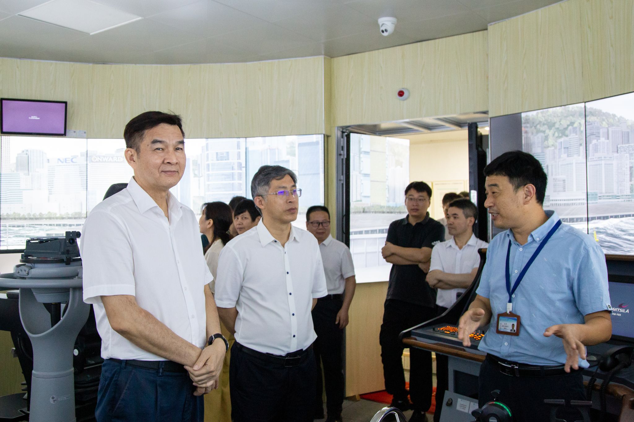 河池学院党委书记韦安光(左一),党委副书记、校长马少健(左二)参观海运学院航海模拟实验室