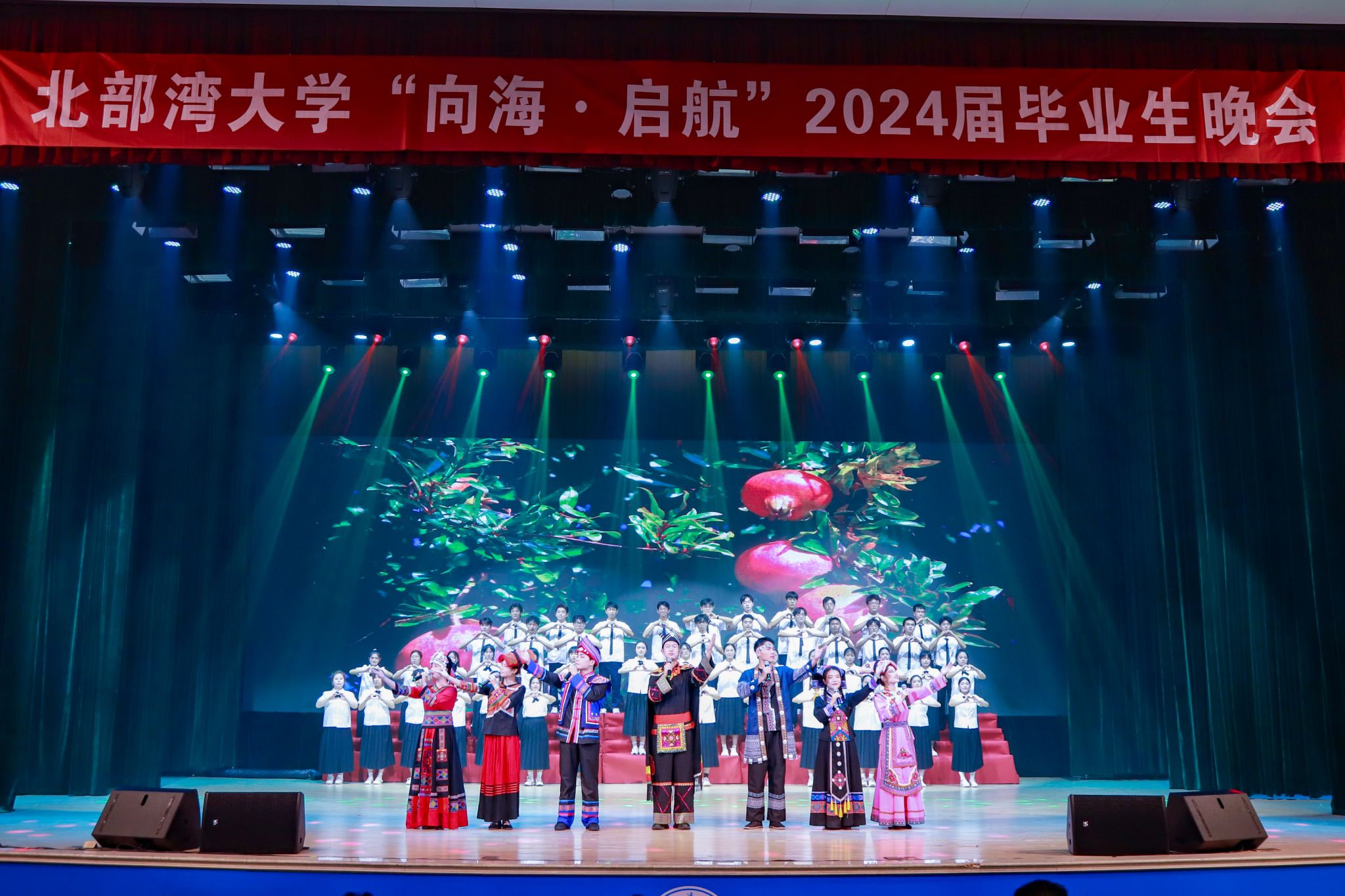 晚会开场,歌曲《想去海边》奏响湾大人心中的向海之志,民歌《云之南》则将广西的民族之美徐徐呈现,现场的气氛渐入佳境。当合唱《踏歌回故乡》奏响,毕业晚会正式拉开帷幕。