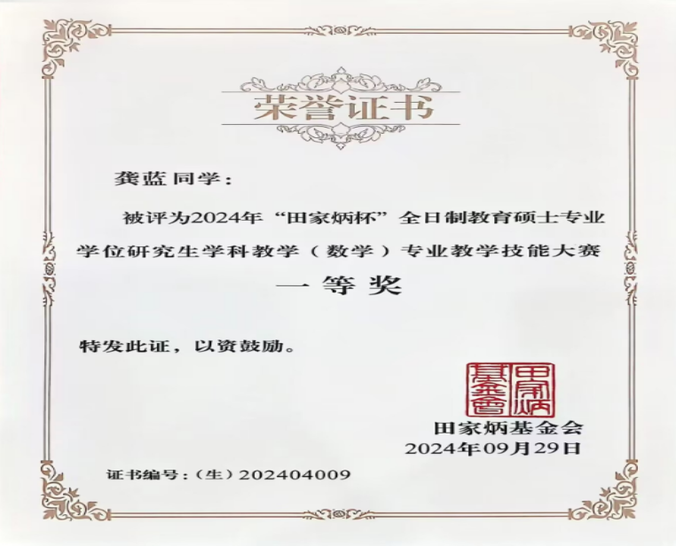 9月27日至30日,2024年全国“田家炳杯”全日制教育硕士专业学位研究生学科教学(数学)专业教学技能大赛决赛暨数学教师教育实践创新论坛在上海交通大学举办。kaiyun体育师生首次参加全国决赛,来自理学院2023级学科教学(数学)教育硕士龚蓝在比赛中脱颖而出获得全国一等奖,其导师梁好翠获优秀指导老师荣誉称号。