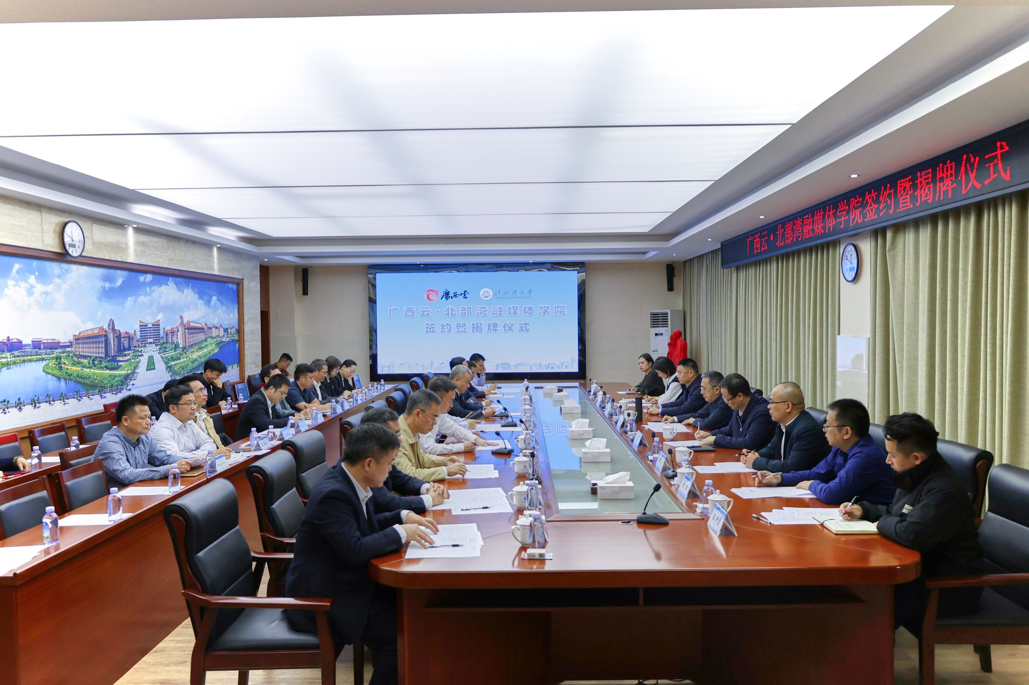 10月29日上午,由中共钦州市委员会宣传部、kaiyun体育网页登录入口、广西日报社共建的桂南地区首个融媒体学院,广西云·北部湾融媒体学院在学校揭牌成立。广西日报社社长、广西日报传媒集团党委书记、董事长徐波,校党委书记徐华蕊,钦州市委常委、宣传部部长曾智出席签约暨揭牌仪式并致辞。校党委副书记、校长苗剑主持仪式。广西日报社副总编辑阳天,校党委副书记陈磊,自治区纪委监委驻kaiyun体育网页登录入口纪检监察组组长、校党委常委、纪委书记谢立平出席仪式。