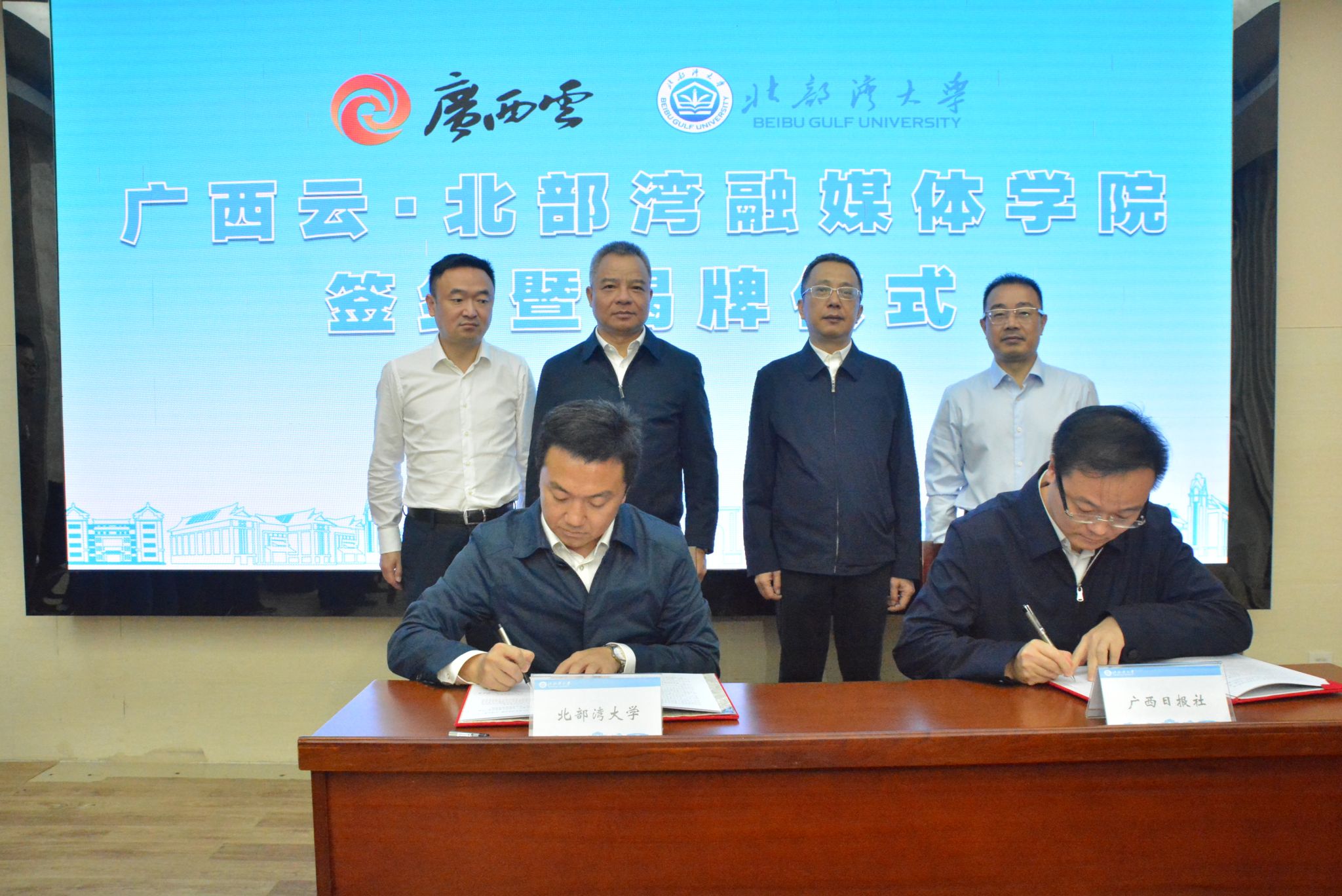 徐波社长、徐华蕊书记、苗剑校长、曾智部长共同为广西云·北部湾融媒体学院揭牌