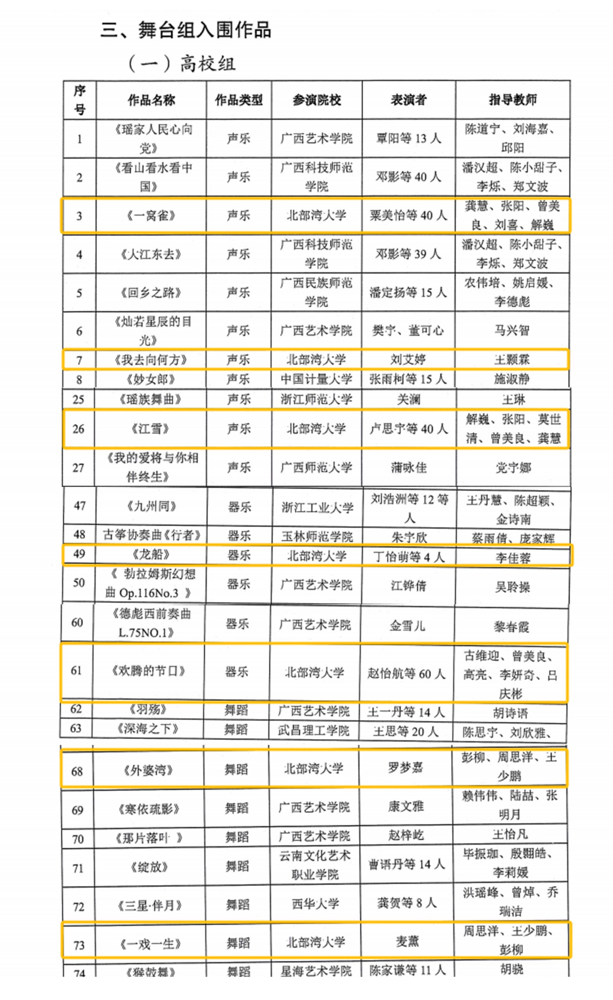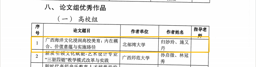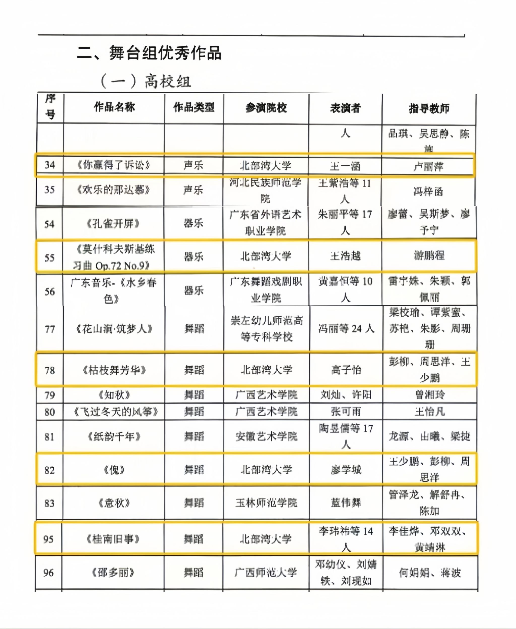 《藤缠树》《蝴蝶飞》《陶燃》等3项作品获舞台组最佳作品,《你赢得了诉讼》等5项作品获舞台组优秀作品,《一窝雀》等7项作品获舞台组入围作品,《日观山海》等3项作品获美术组入围作品,《广西海洋文化浸润高校美育:内在耦合、价值意蕴与实施路径》获论文组优秀作品。