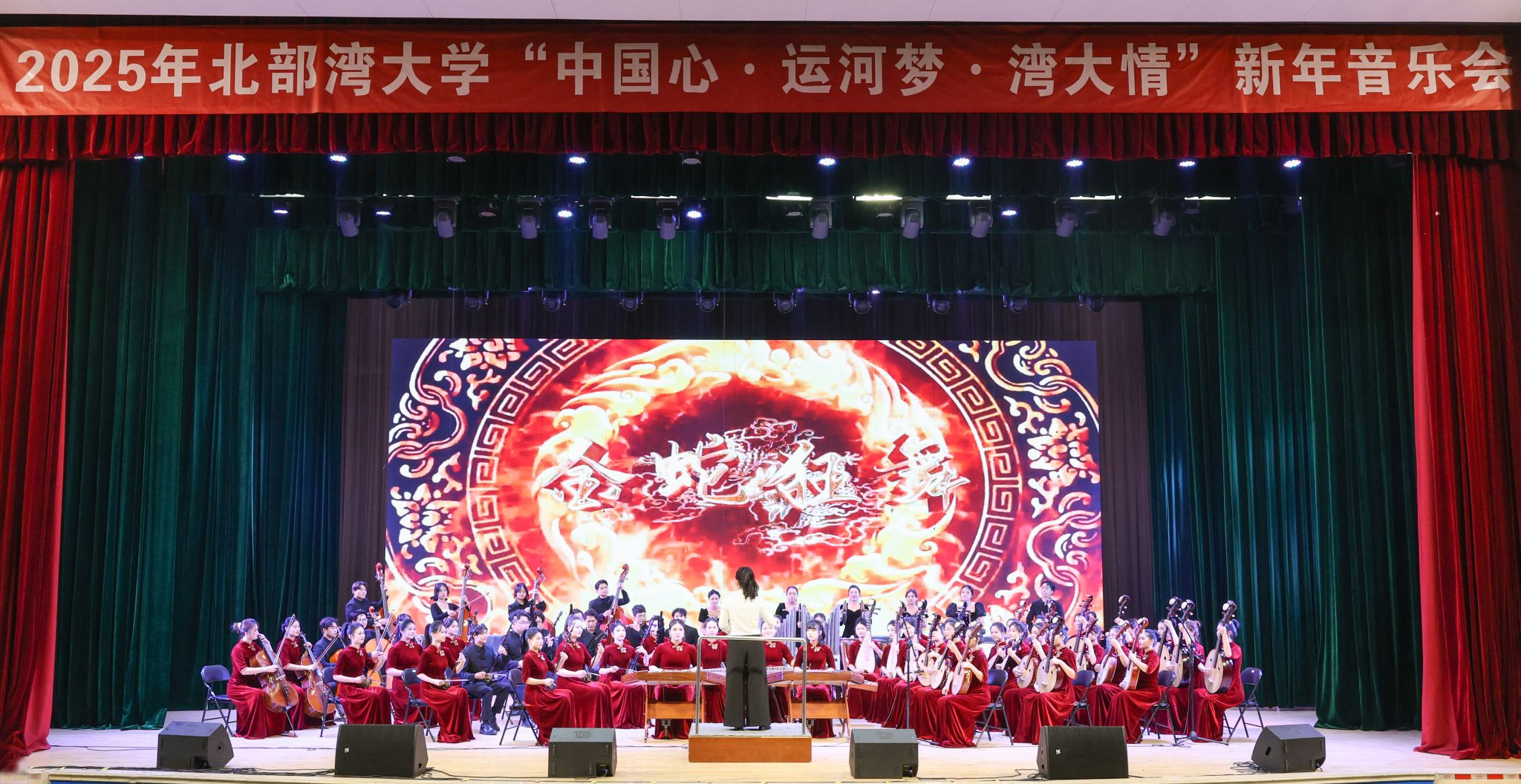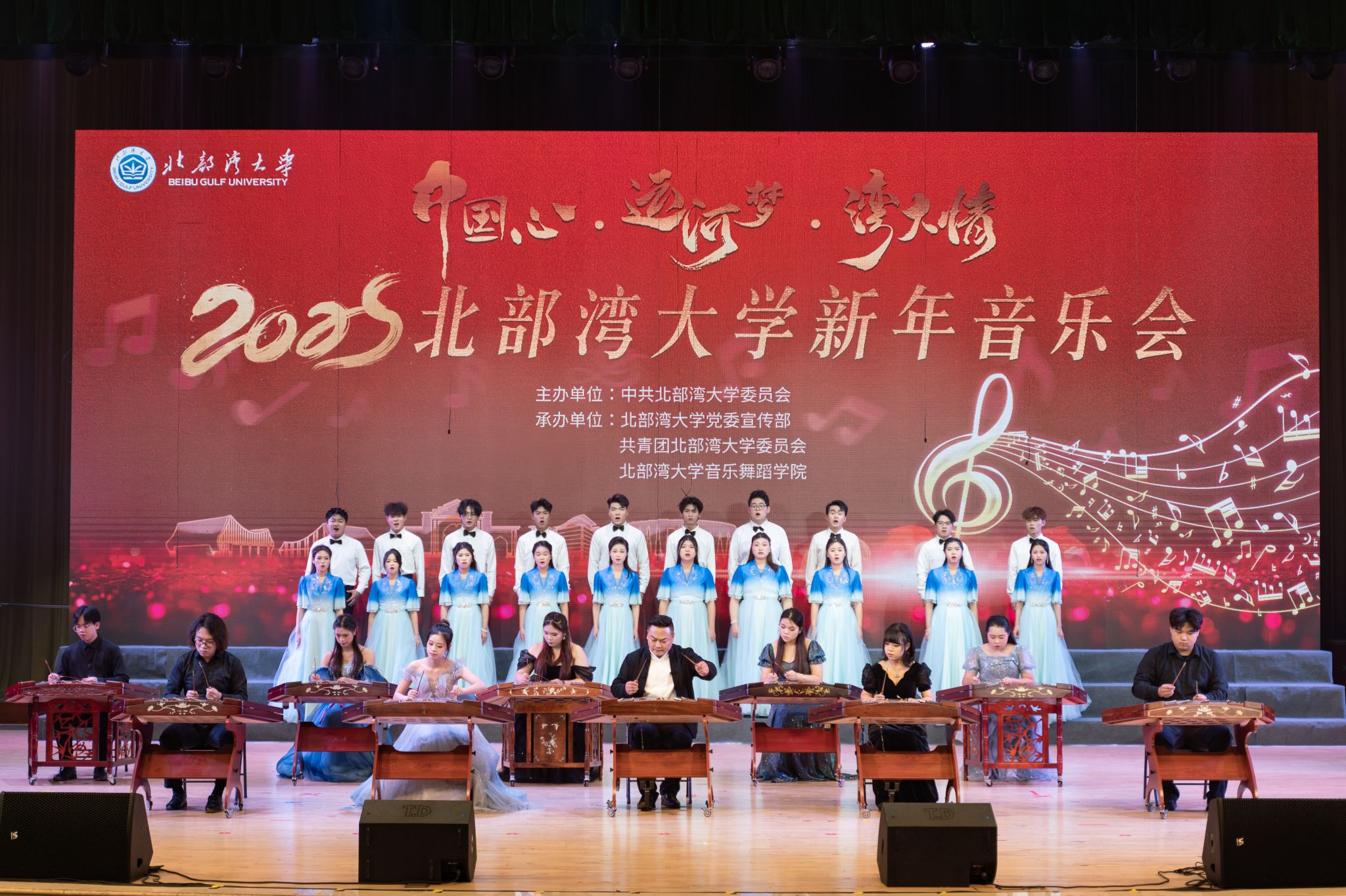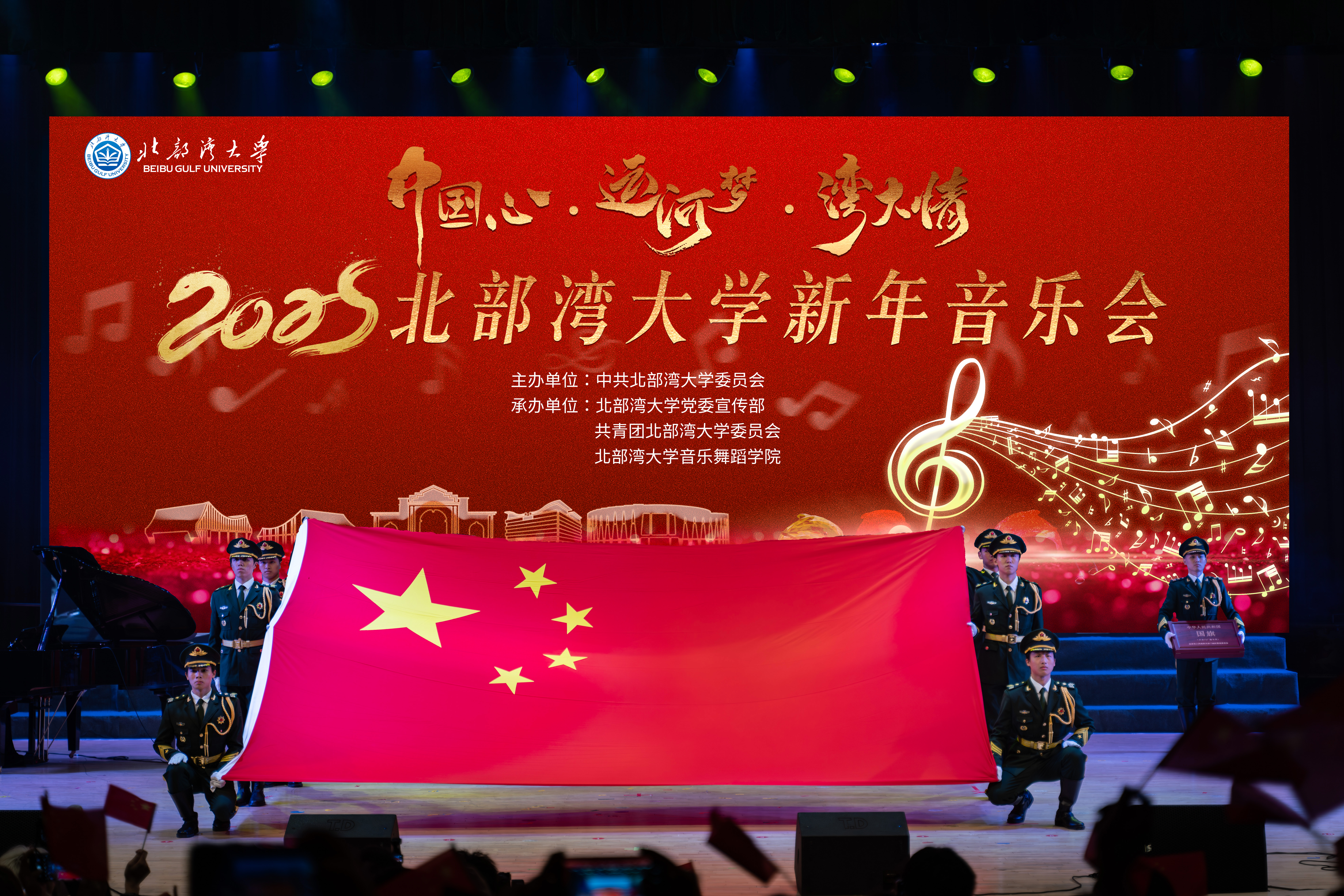 2025年新年音乐会以“中国心·运河梦·湾大情”为主题,在平陆运河之滨精彩上演。平陆运河,通江达海,承载着沿岸人民对美好未来的憧憬与梦想,将历史的深邃与未来的辉煌紧紧相连。音乐会节目精选运河元素原创佳作与经典曲目,生动展现了湾大师生服务运河建设和广西“一区两地一园一通道”建设,推动向海经济、促进开放开发的满腔热忱。悠扬动听的旋律抒发着湾大师生对祖国的深情厚爱与无限自豪。家国情怀与边疆风情交相辉映,向海图强的新姿态在极具地方特色的音乐中熠熠生辉。
