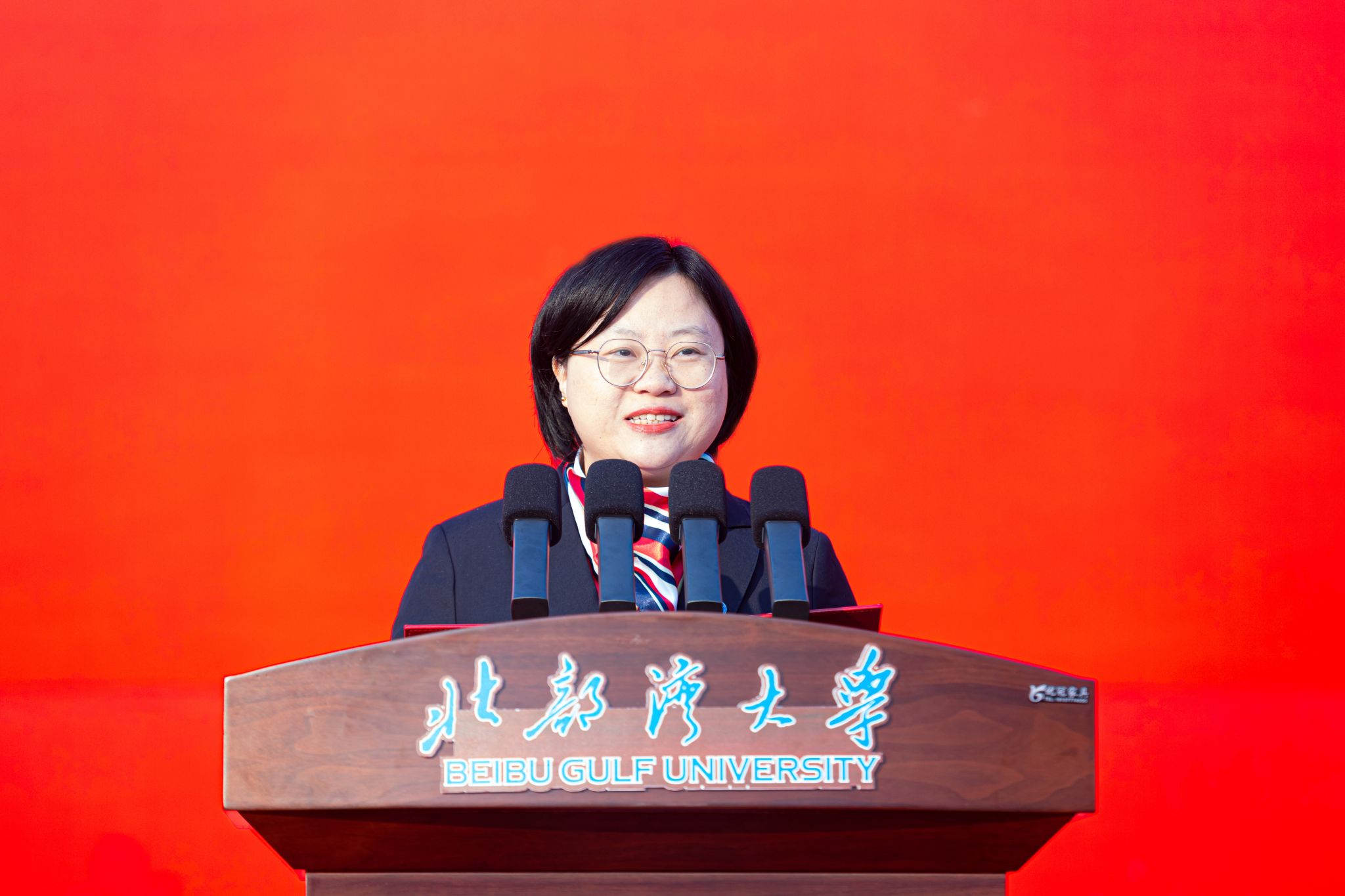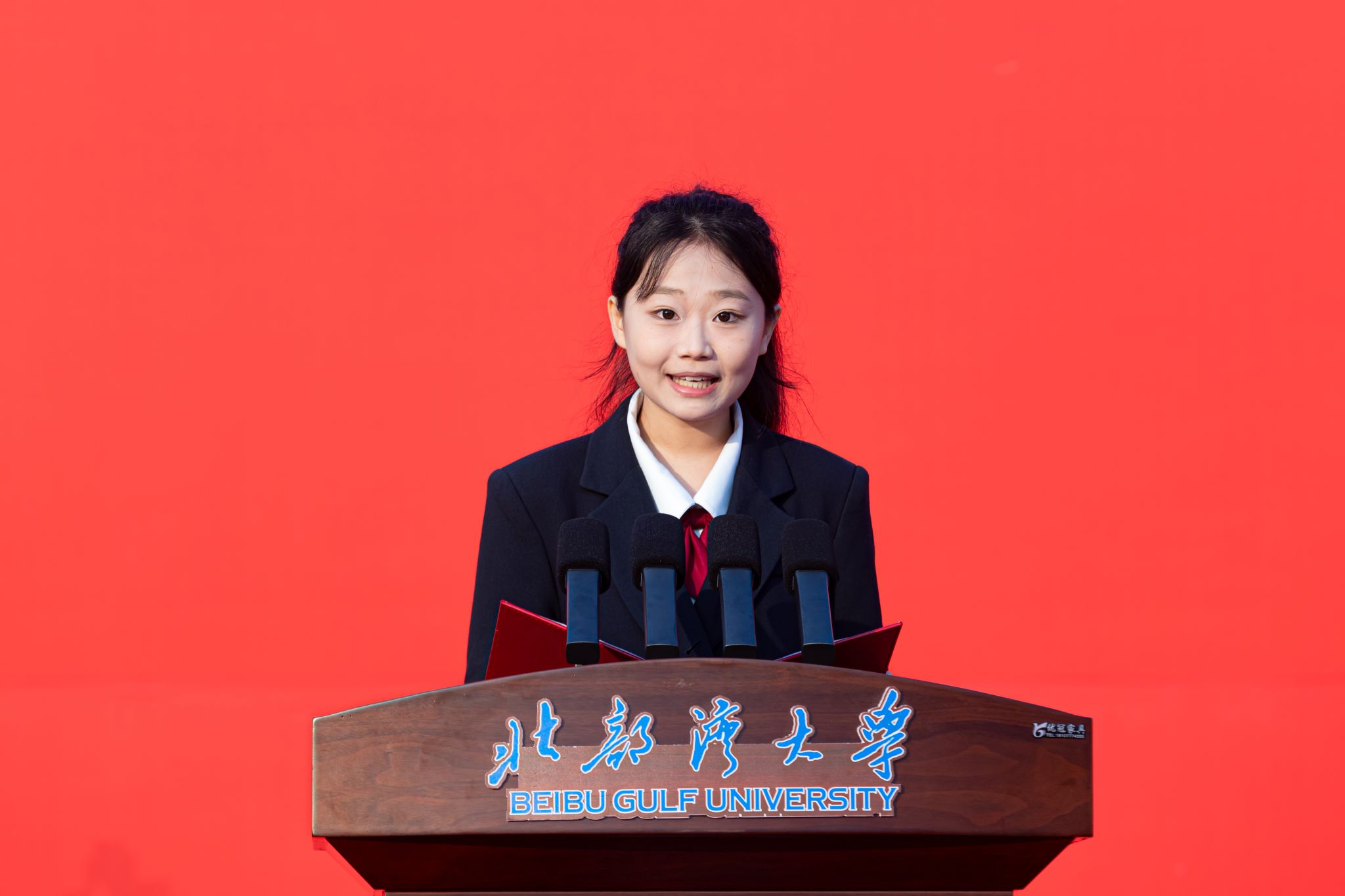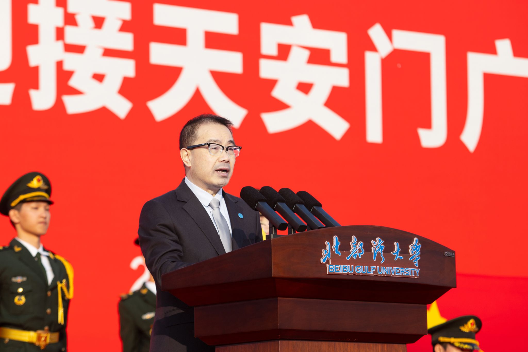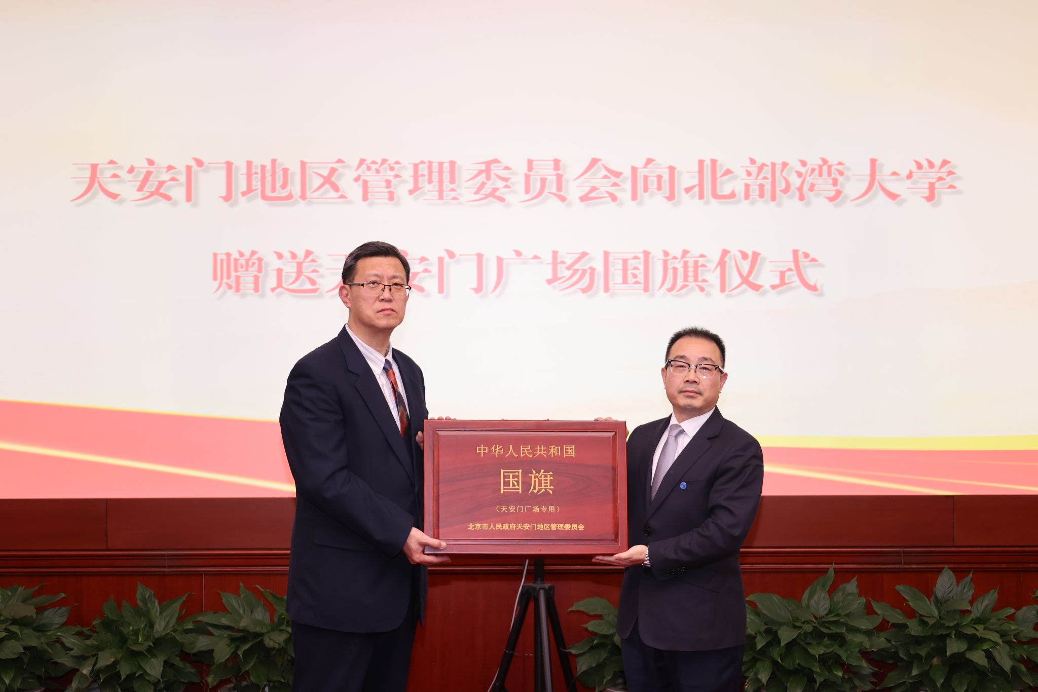 仪式由校党委副书记、校长苗剑主持。他表示,学校获赠的这面意义非凡的天安门广场国旗,点燃了湾大师生心中的赤诚,全校师生要牢记国旗不仅是国家主权和尊严的象征,更是开展爱国主义教育的特殊载体,在今后的学习与实践中坚定理想信念,厚植爱国情怀,勇于担当使命,自觉把爱国情、强国志、报国行融入实现中华民族伟大复兴的征程中,共同为中华民族伟大复兴贡献智慧和力量!