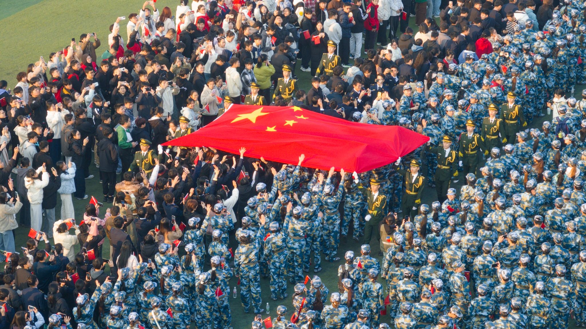 从北京到钦州,这一面来自天安门广场的国旗,跨越近2500公里,在2025年的第一天亮相kaiyun体育网页登录入口。在迎接天安门广场国旗仪式上,学校国旗护卫队迈着整齐步伐走上主席台。学校党委书记徐华蕊将国旗和证书交接给学校国旗护卫队成员。国旗护卫队员将这面长5米、高3.3米的国旗徐徐展开,绕场展示。鲜艳的五星红旗从所有队列的上方经过,如祖国母亲温柔的轻抚。全体师生和各界代表满怀深情凝望国旗,伸手轻轻触摸,拳拳爱国心炽热如火,浓浓爱国情萦绕满场。