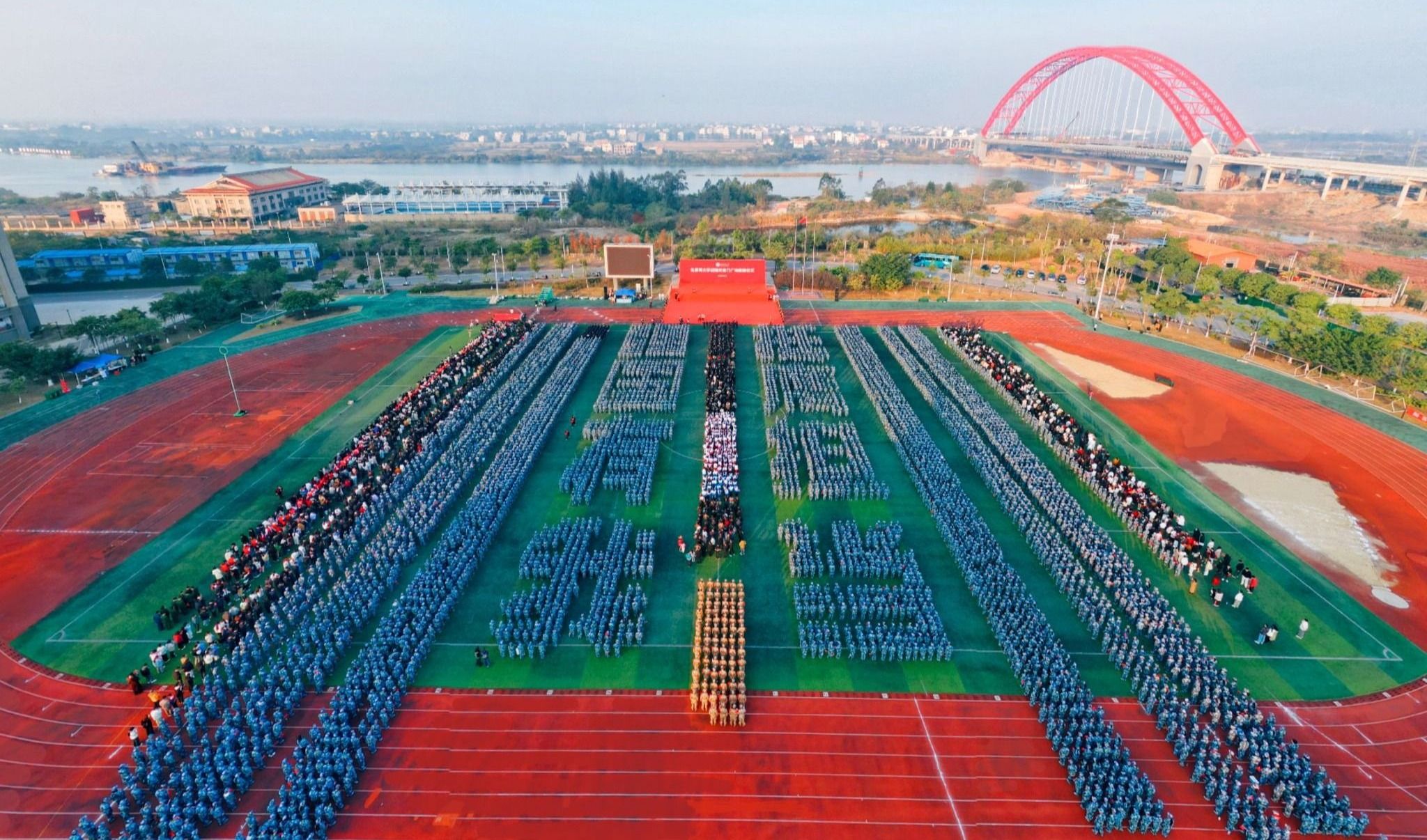 《歌唱祖国》雄壮的音乐响起,现场师生目光齐聚主席台中央的五星红旗,挥舞着手中国旗,用歌声向国旗致敬,唱响爱党爱国主旋律。五星红旗荣光至,湾大向海扬帆起!(周晟旻 韦文翰 廖泽湖 孙浩源 摄)