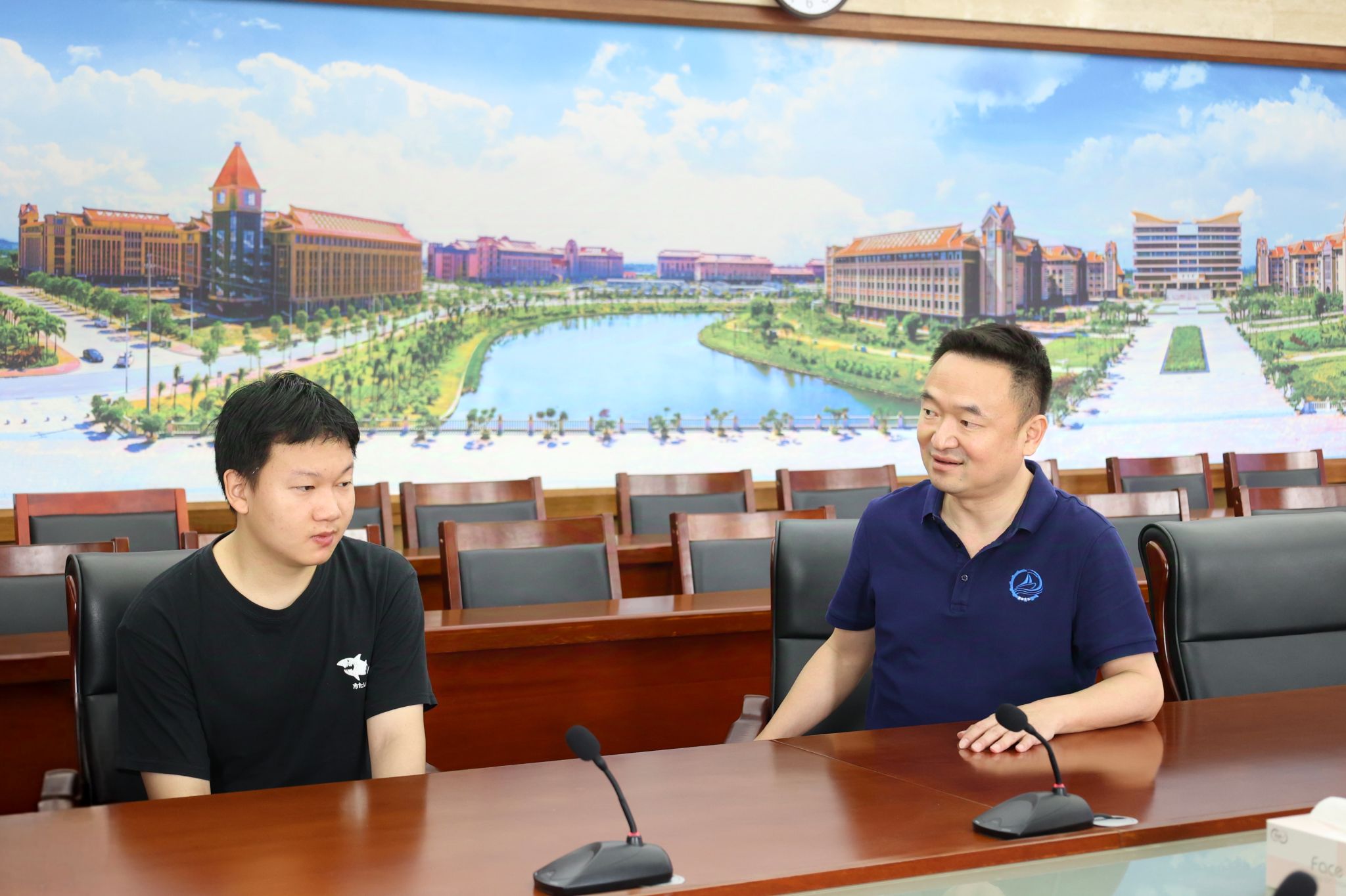 4月14日,校党委副书记、校长苗剑在学校会议室欢迎载誉归来的高龙峰同学,对其取得的突破性成绩表示热烈祝贺,勉励其总结和分享数学学习方法经验,发挥示范引领作用,带动更多同学再创佳绩。苗剑关心关怀高龙峰的学习生活情况,希望他在今后的学习生活中立足自身优势、锚定长远目标,不断深耕专业、探索前沿,不负韶华,筑梦前行,争取更大进步,成长为德智体美劳全面发展的社会主义建设者和接班人,为全面建设社会主义现代化国家贡献青春力量。