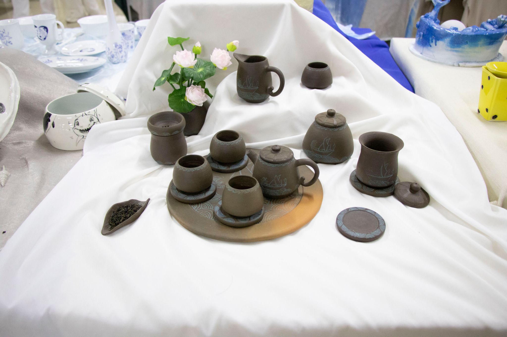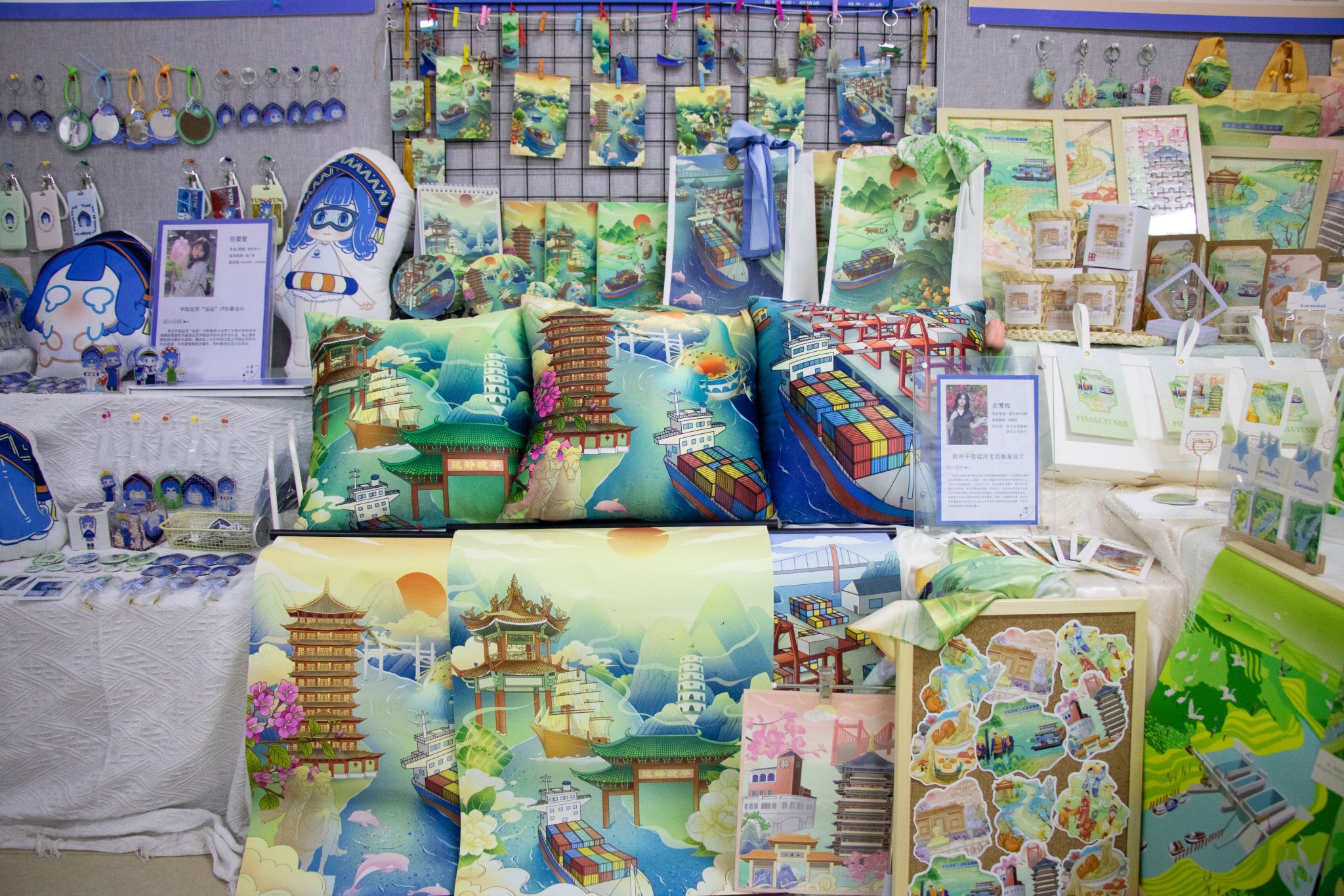 展览以平陆运河文化传承与创新为主线,以运河生态、历史文脉、城乡发展为脉络,汇集2025届视觉传达设计、环境设计、产品设计、美术学4个专业335名毕业生的335件/套作品,既有传统陶瓷技艺的匠心呈现,亦有数字媒体、智能交互等前沿技术的融合探索。视觉传达设计专业通过动态影像与品牌视觉系统重构运河文化符号,环境设计专业作品聚焦运河沿岸生态景观与文旅空间规划,产品设计专业将运河元素融入陶瓷器型与釉彩创新,美术学专业以国画、版画、油画、水彩画等形式再现运河人文风貌。展出作品通过多元艺术形式展现了平陆运河的历史底蕴与时代价值,彰显了湾大青年学子扎根地域文脉、践行创新使命的责任担当。(李美晴 苏渝岚 摄)
