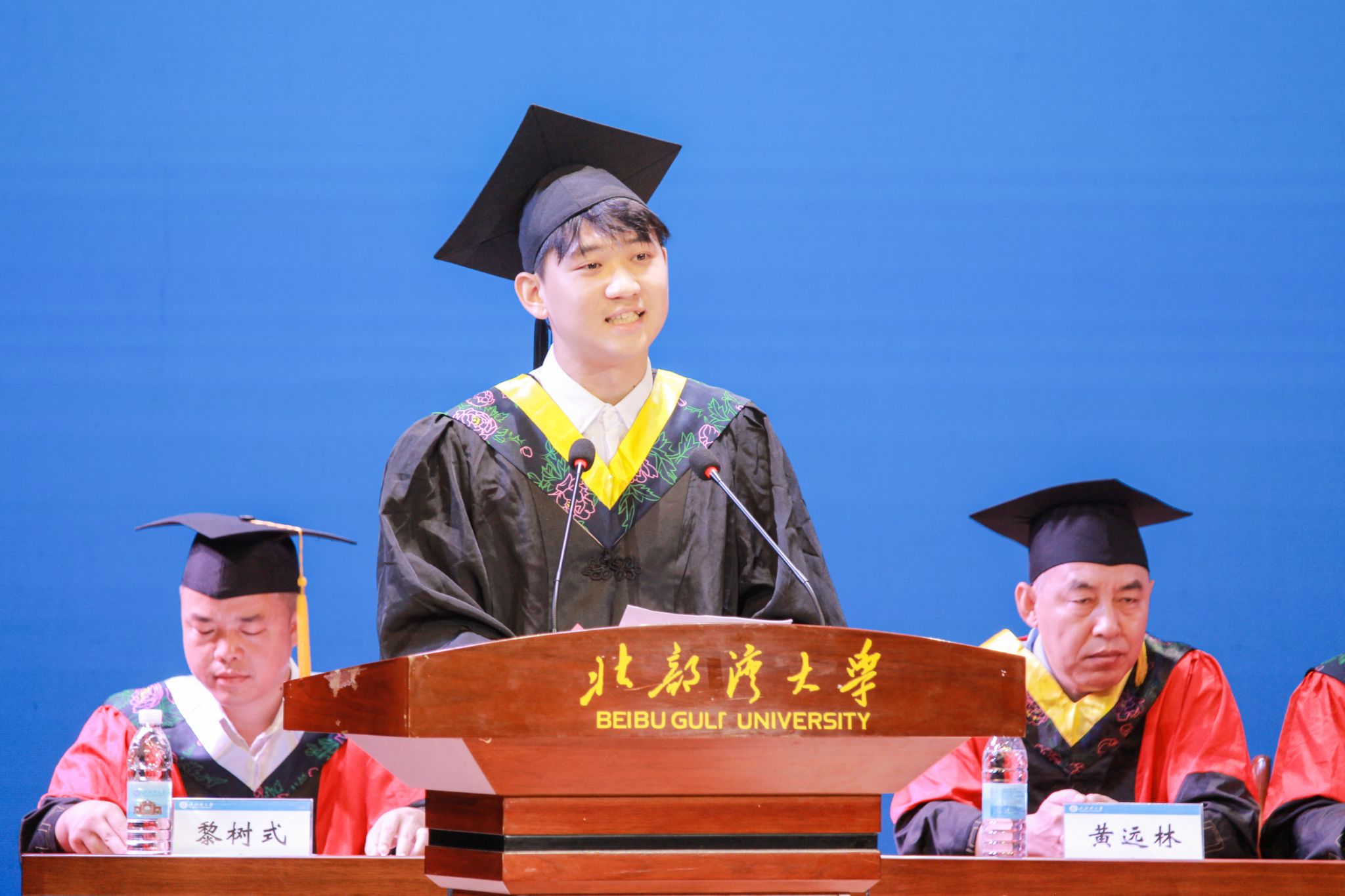 毕业生本科生代表、电子与信息工程学院智能本212班林国淼讲述了大学四年与湾大共同成长的历程。他表示,将秉持“海纳百川”的胸怀与“知行合一”的信念,奔赴辽阔天地,在祖国大地上历练成长,绽放湾大学子的璀璨光芒。