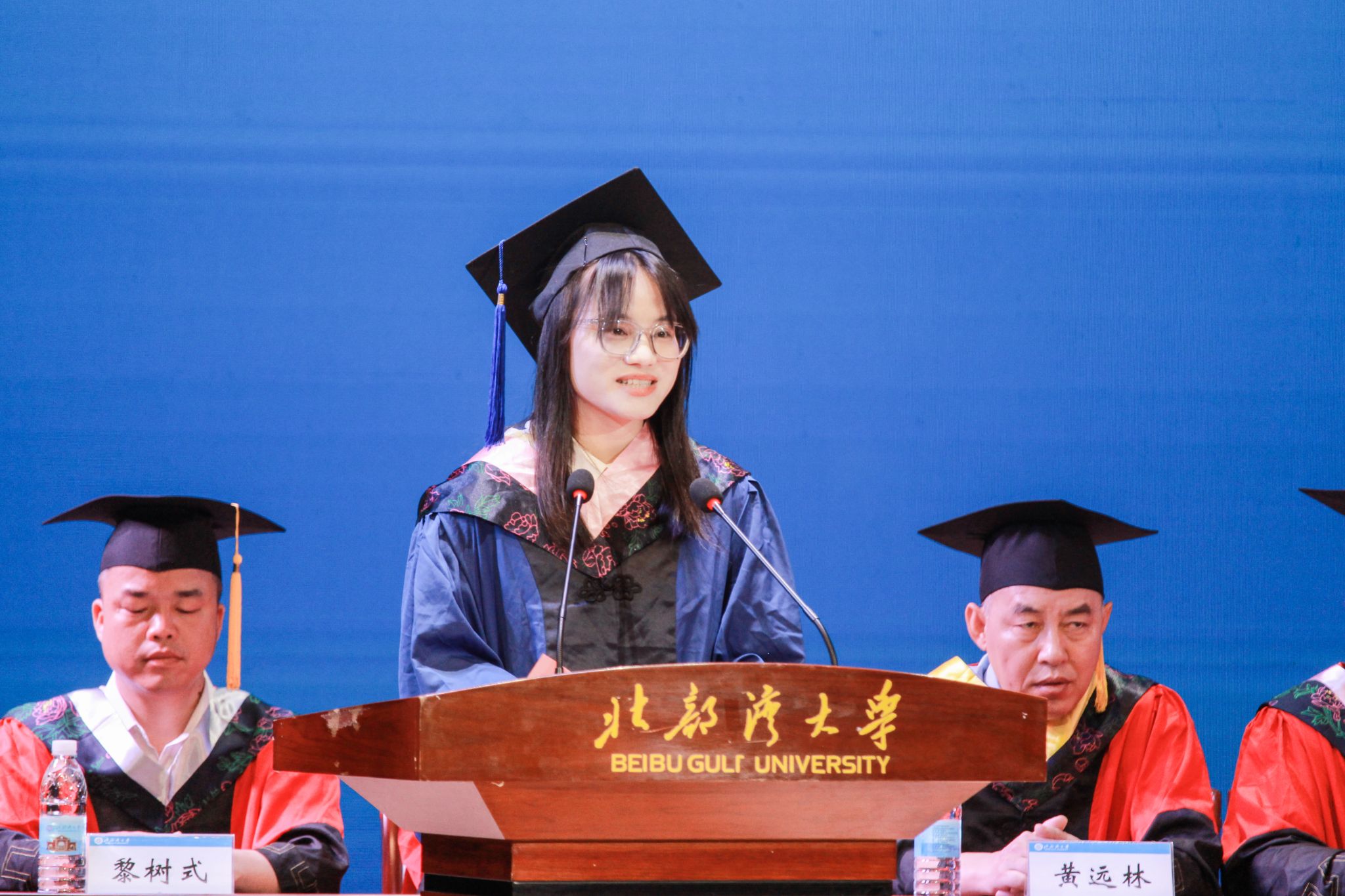 毕业生研究生代表、经济管理学院国商研221班杨艳塬深情回顾了在湾大求学的七载光阴。她表示,将会带着母校给予的学术积淀与殷殷期许,以奋斗为墨,在强国建设、民族复兴新征程上书写青春答卷。