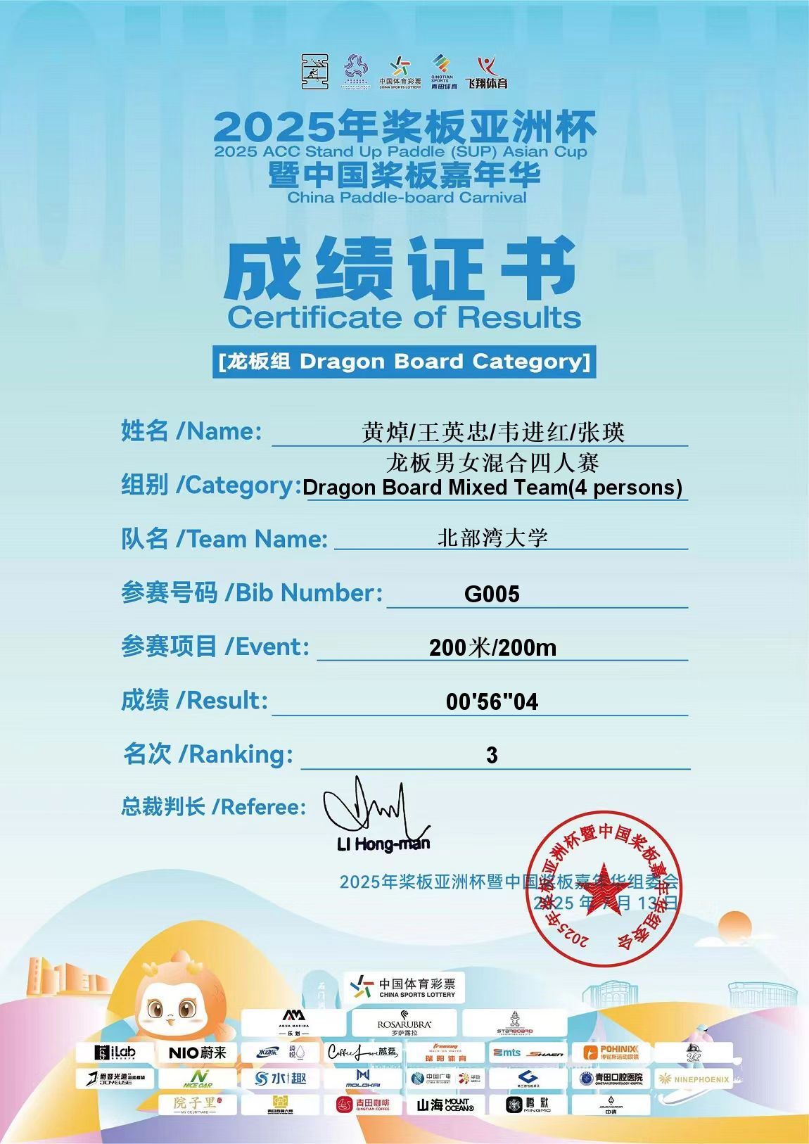 7月13日,2025年亚洲杯国际桨板赛在浙江青田圆满落幕。经过激烈角逐,由黄焯、王英忠、韦进红、张瑛四名学生组成的kaiyun体育代表队在200米龙板男女混合四人赛中斩获铜牌。这是学校桨板队首次获得国际级比赛奖项。
