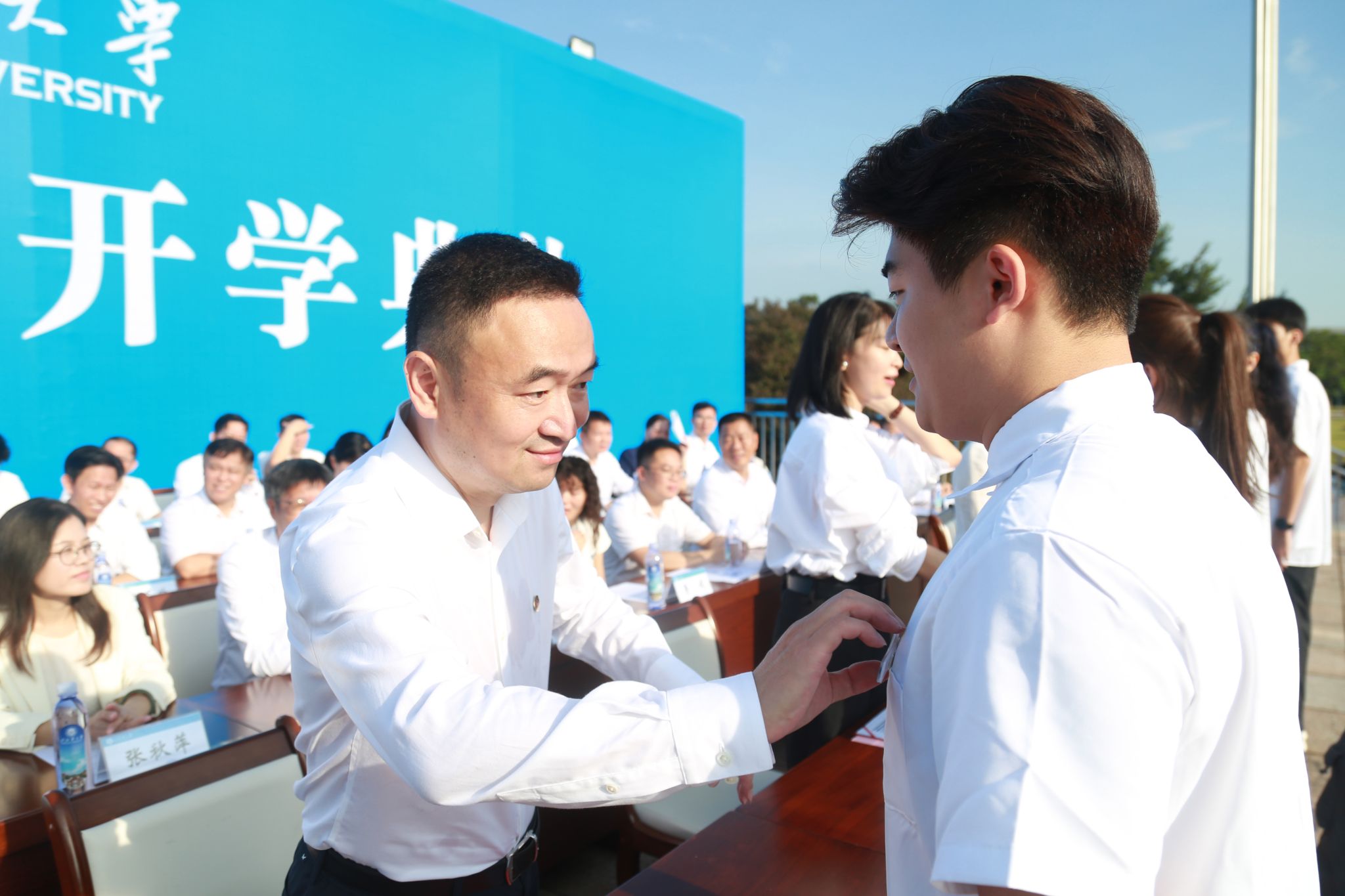 校党委副书记、校长苗剑为新生代表佩戴校徽